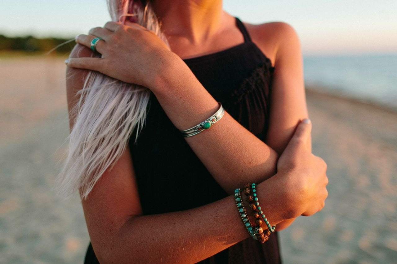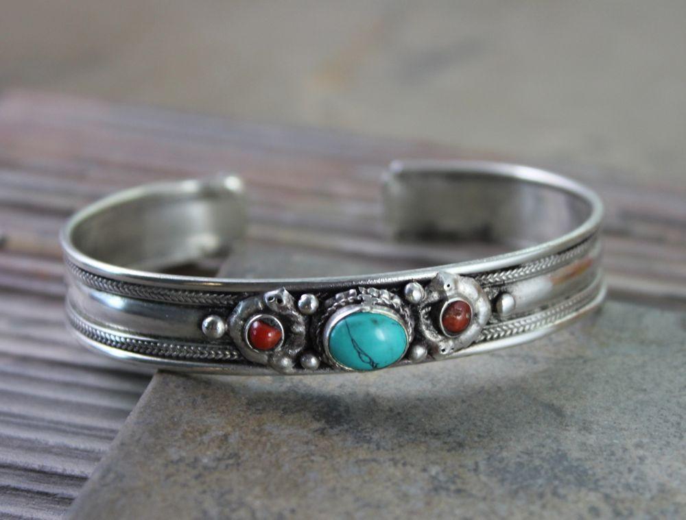 Nuestros clientes han estado pidiendo más pulseras y tenemos cientos de ellas llegando desde Nepal. Esta pulsera plateada tiene 2 pequeños corales y una piedra turquesa en un diseño tradicional tibetano.