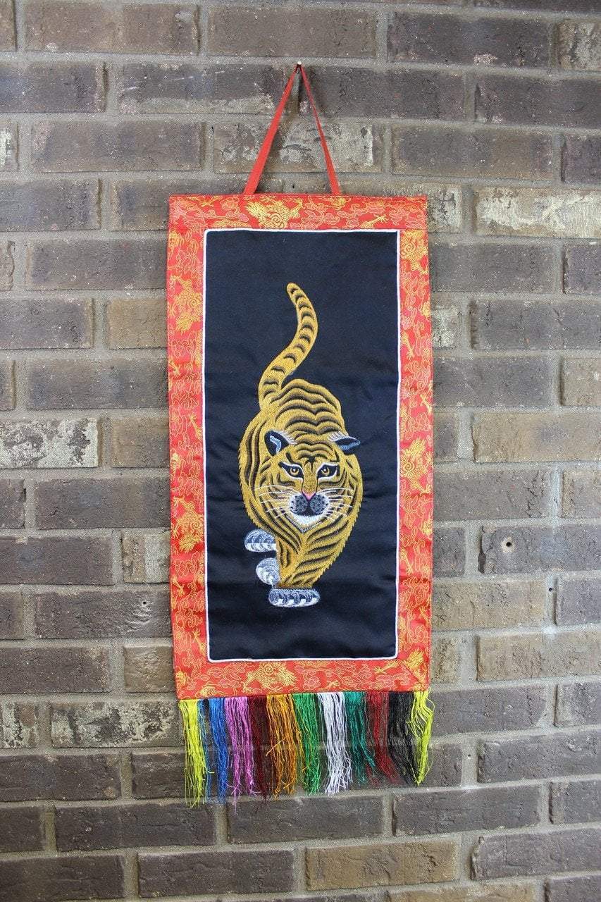 Increíble tapiz de tigre con brocado rojo y flecos multicolores.