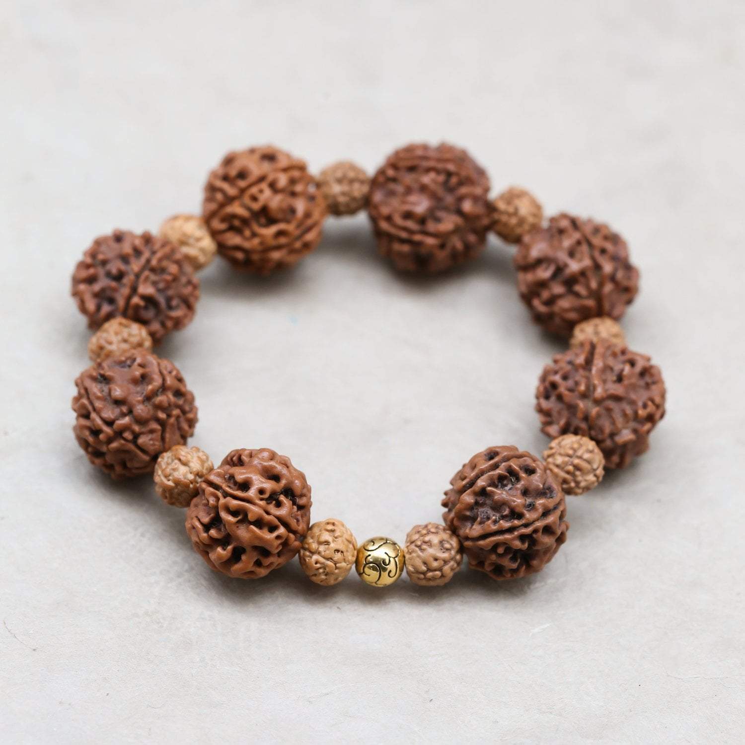 La muñeca mala mide aproximadamente 7 pulgadas alrededor del cordón elástico. Las cuentas de Rudraksha miden 17-19 mm con espaciadores de 8 mm y una cuenta de latón de 7 mm.