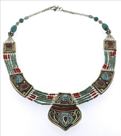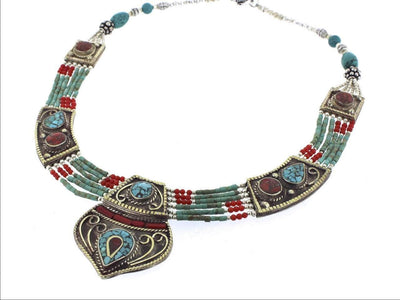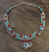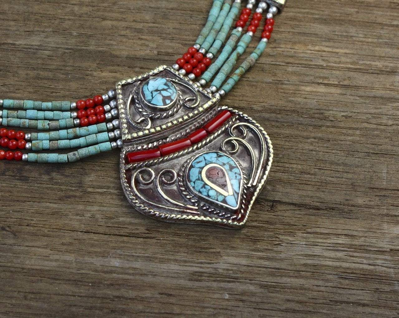 Otro increíble collar tibetano de los estudios de Karma Dolma en Katmandú. Piedras de turquesa y coral incrustadas a mano en cuentas tibetanas de latón plateado.