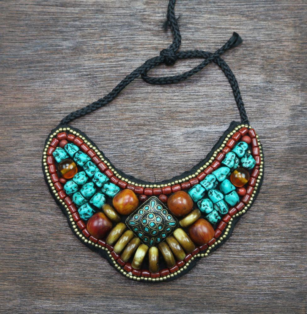 Estos collares tradicionales están regresando a las comunidades tibetanas de todo el mundo. Las versiones antiguas de estos collares tenían cuentas comerciales por valor de miles de dólares; nuestra versión moderna está hecha a mano en Nepal con cuentas de coral falso y turquesa prensada con ámbar copal. Hermosa y atrevida pieza única.