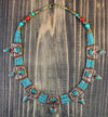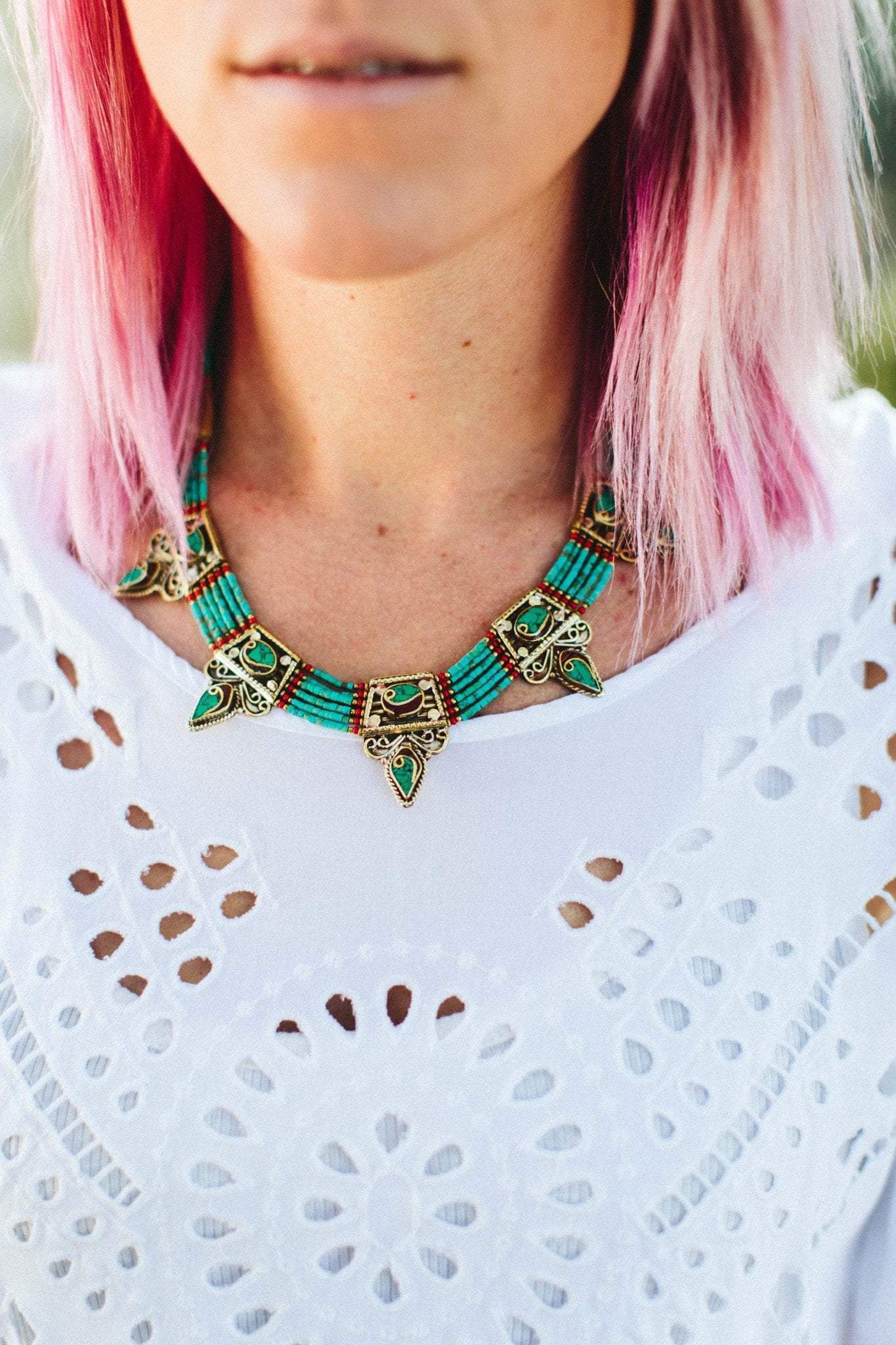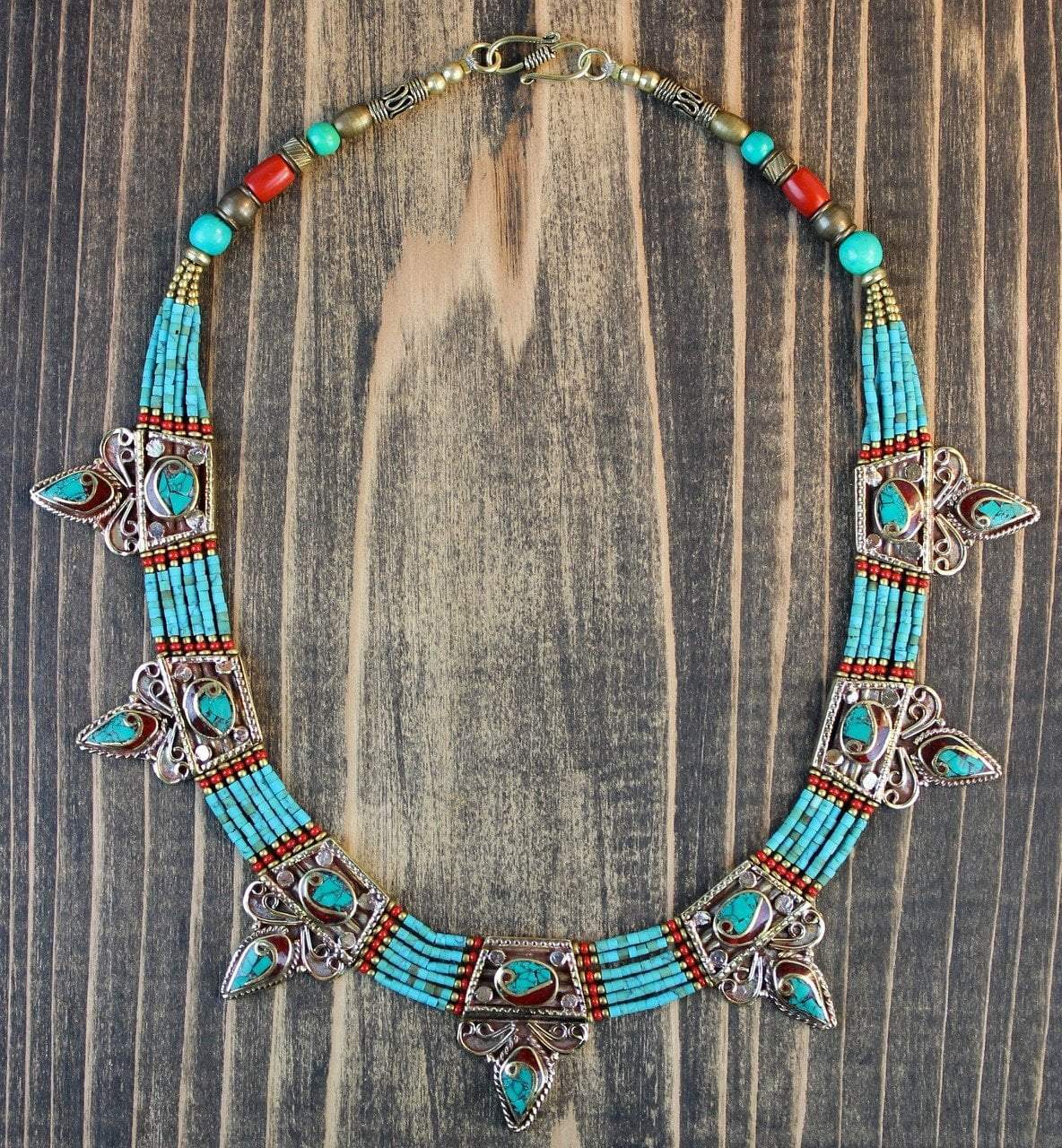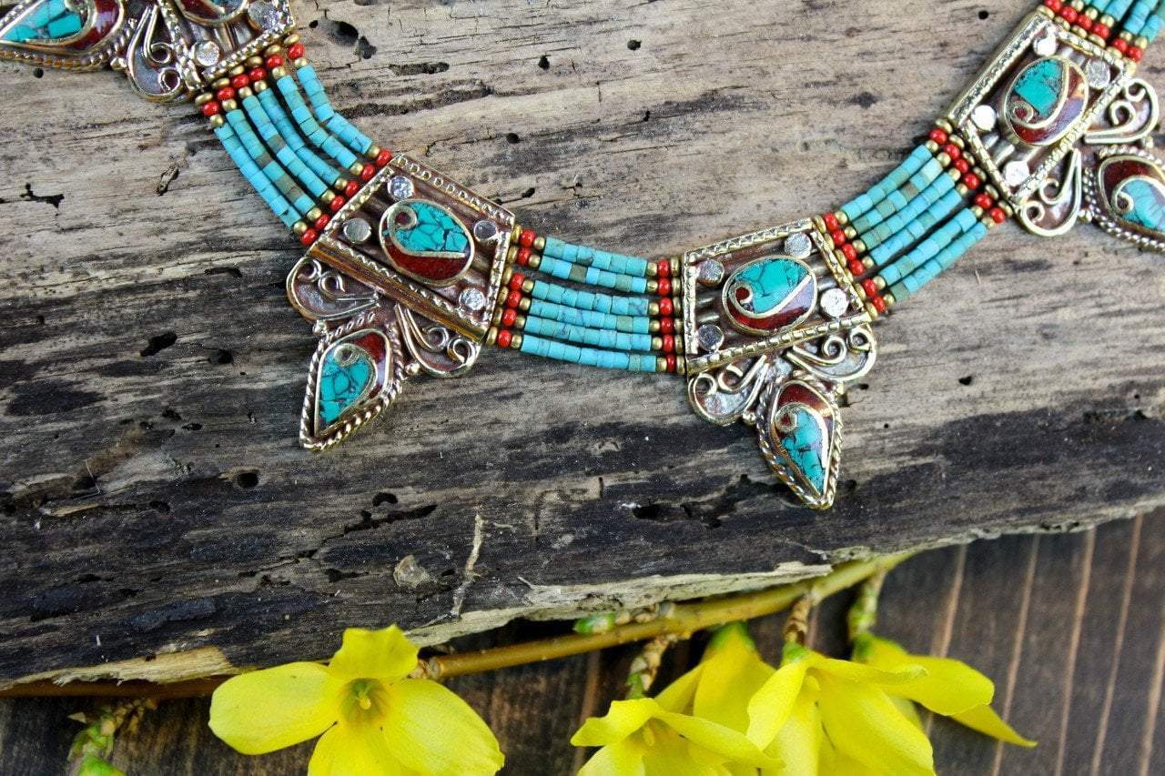 Este impresionante collar estilo babero tribal presenta cuentas de coral, latón y turquesa, así como piedras de mosaico de coral y turquesa con incrustaciones en un engaste plateado. 100% hecho a mano en Nepal.