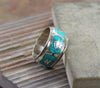 Anillo de plata de primera ley con incrustación de turquesa. La escritura tibetana del mantra de la compasión, Om Mani Padme Hung, está aplicada dentro de la turquesa.