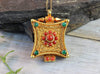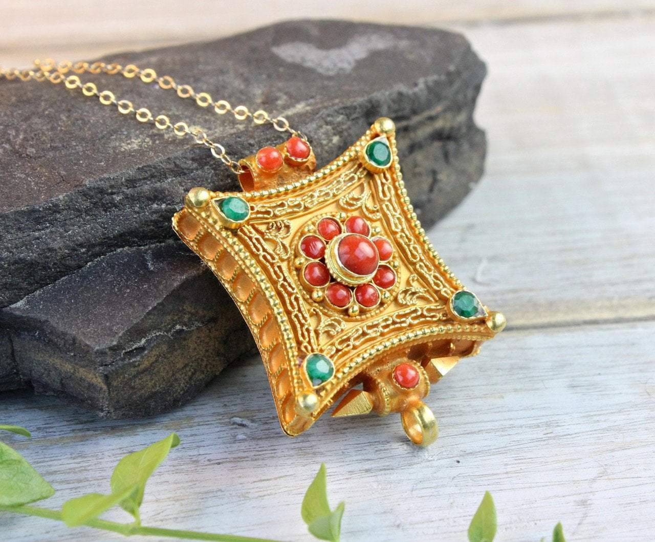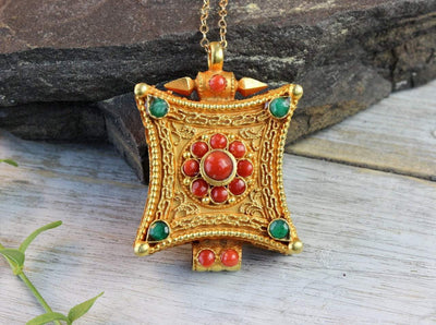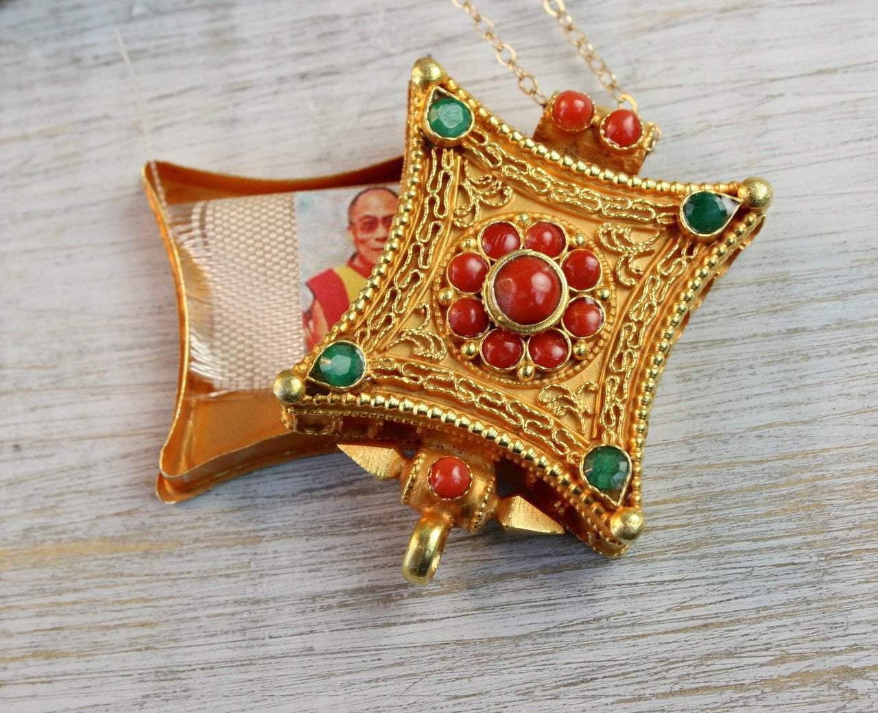 Un amuleto gau tibetano muy especial. Upala significa "joya" en sánscrito. Plata de ley maciza .925 bañada en oro de 24k y engastada con piedras de coral y aventurina. La parte posterior se abre para revelar una imagen de SS el Dalai Lama y un trozo de tela de oración (kata).