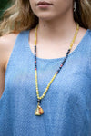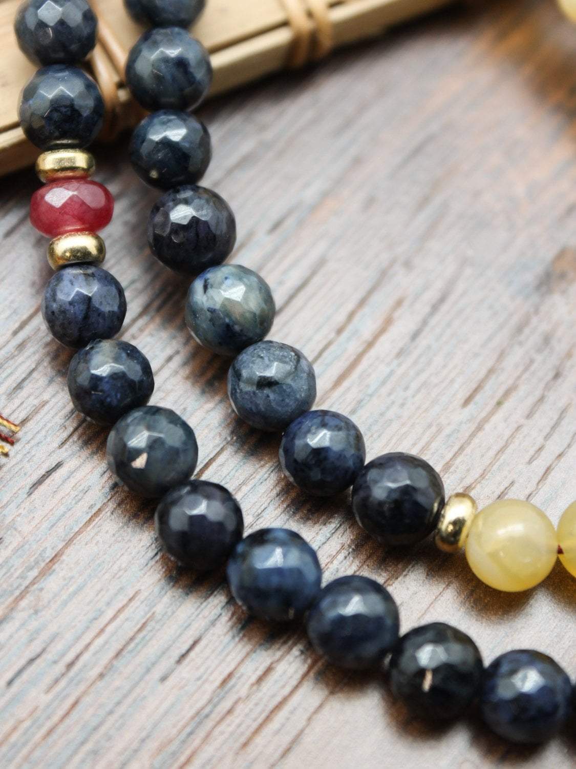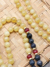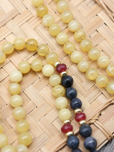 ¡Una mala de 108 cuentas verdaderamente exclusiva y de edición limitada de nuestra colección DharmaShop! Incluye un magnífico ópalo amarillo miel y cuentas facetadas de dumortierita con una cuenta de gurú de ojo de tigre azul. Está rematado con un amuleto y una borla de Buda tailandés bañados en oro. ¡Se puede usar alrededor del cuello o alrededor de la muñeca!