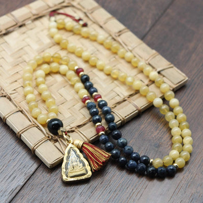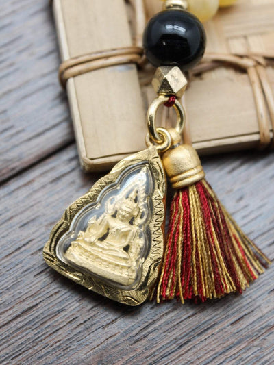 El principal punto focal del mala es el amuleto dorado de Buda. Está fabricado por monjes en Bangkok y envuelto en latón chapado en oro con una cubierta de plástico para protección. El Buda sentado o meditando aporta paz, calma y serenidad. Los amuletos tailandeses no deben sumergirse en agua; quítelos antes de bañarse o nadar.