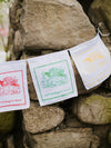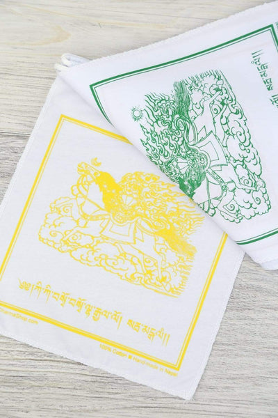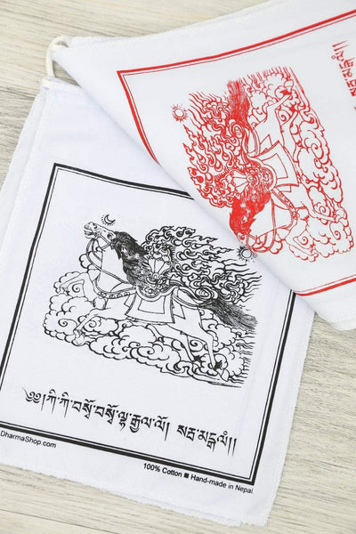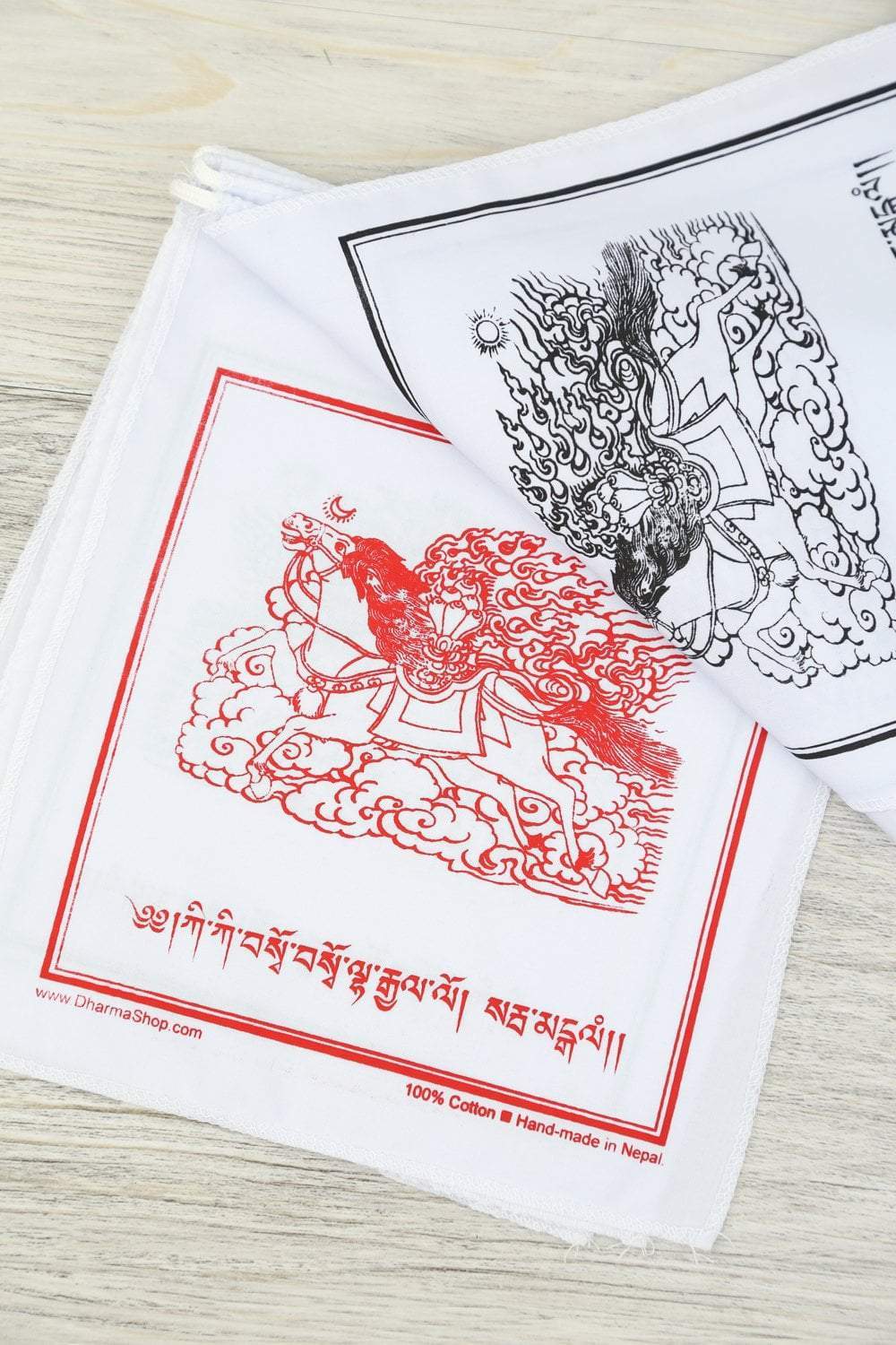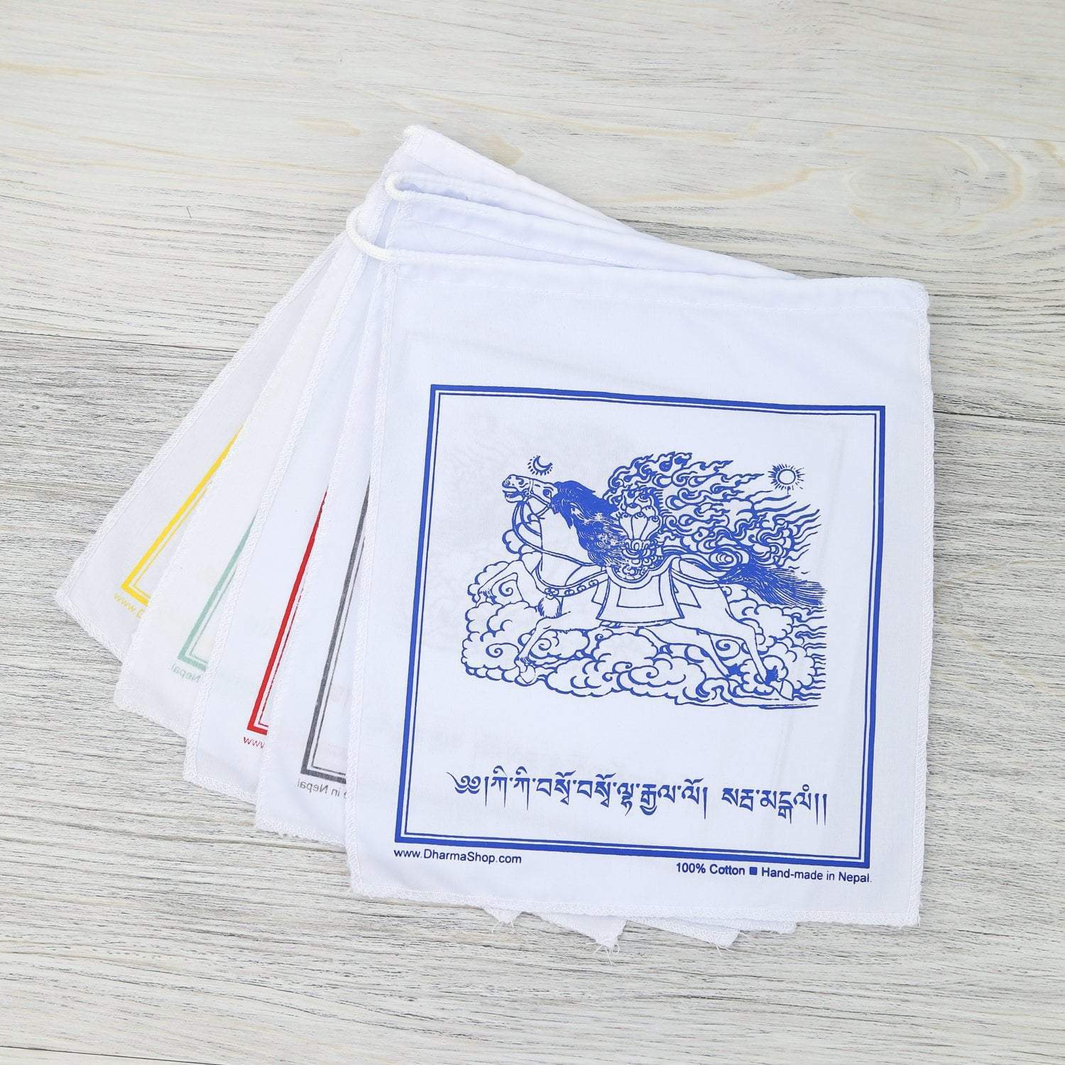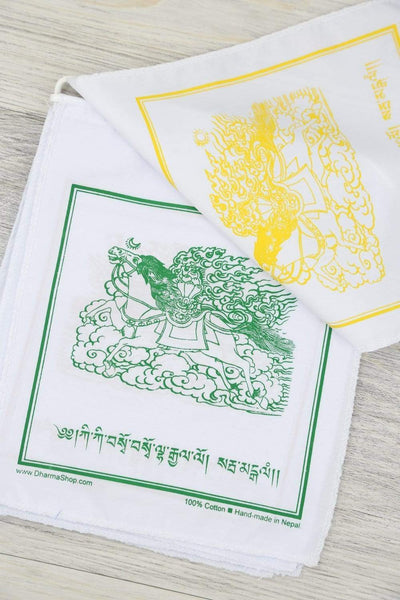 • ¡Estas banderas de algodón con dobladillo son un diseño exclusivo de DharmaShop! Presentan un diseño tradicional de Windhorse más grande junto con una sencilla oración tibetana.