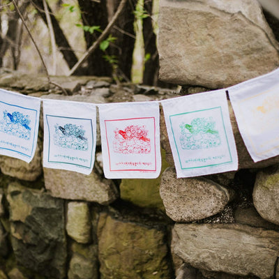 El diseño está impreso con los 5 colores tradicionales de las banderas de oración en todas las banderas blancas para emular el aspecto de las banderas descoloridas que se ven colgadas por todo el Tíbet y Nepal. El desvanecimiento de las banderas de oración se considera auspicioso. Es una señal física de que las oraciones fueron llevadas por la brisa.
