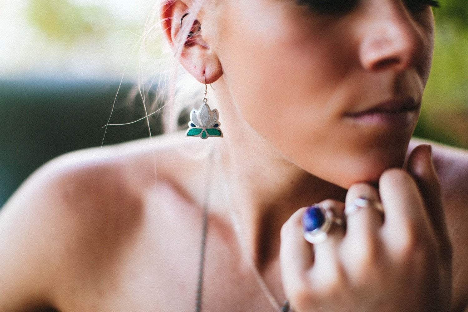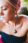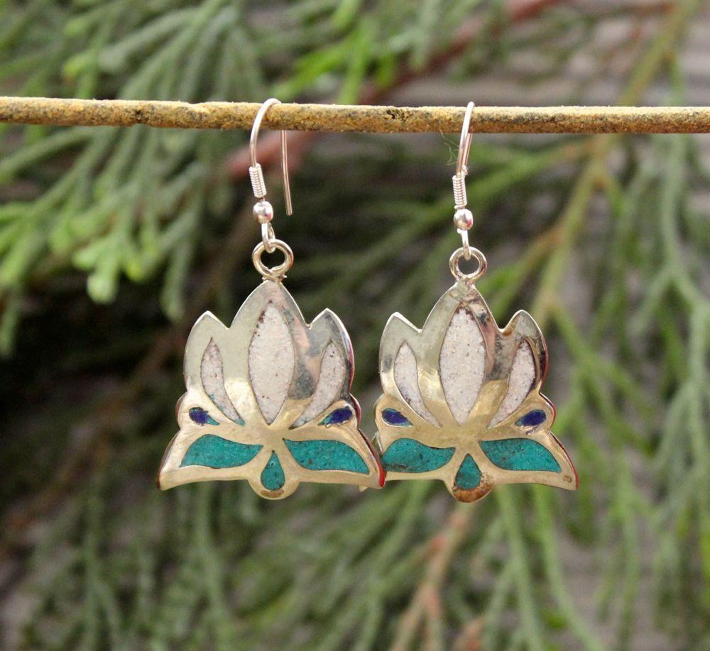 Un encantador conjunto de aretes hechos en Katmandú, Nepal. Bañado en plata, liviano e incrustado de turquesa y copal.