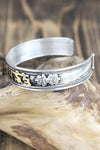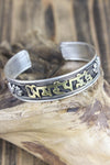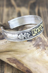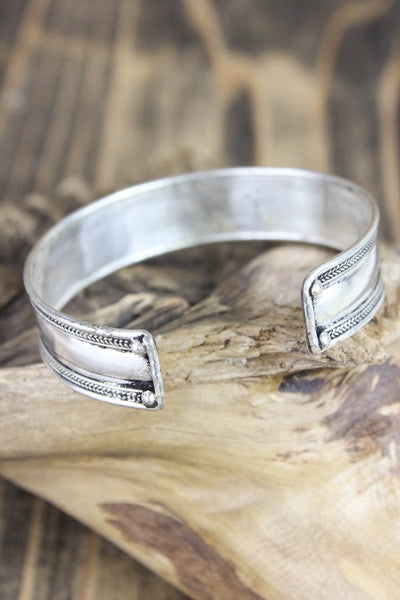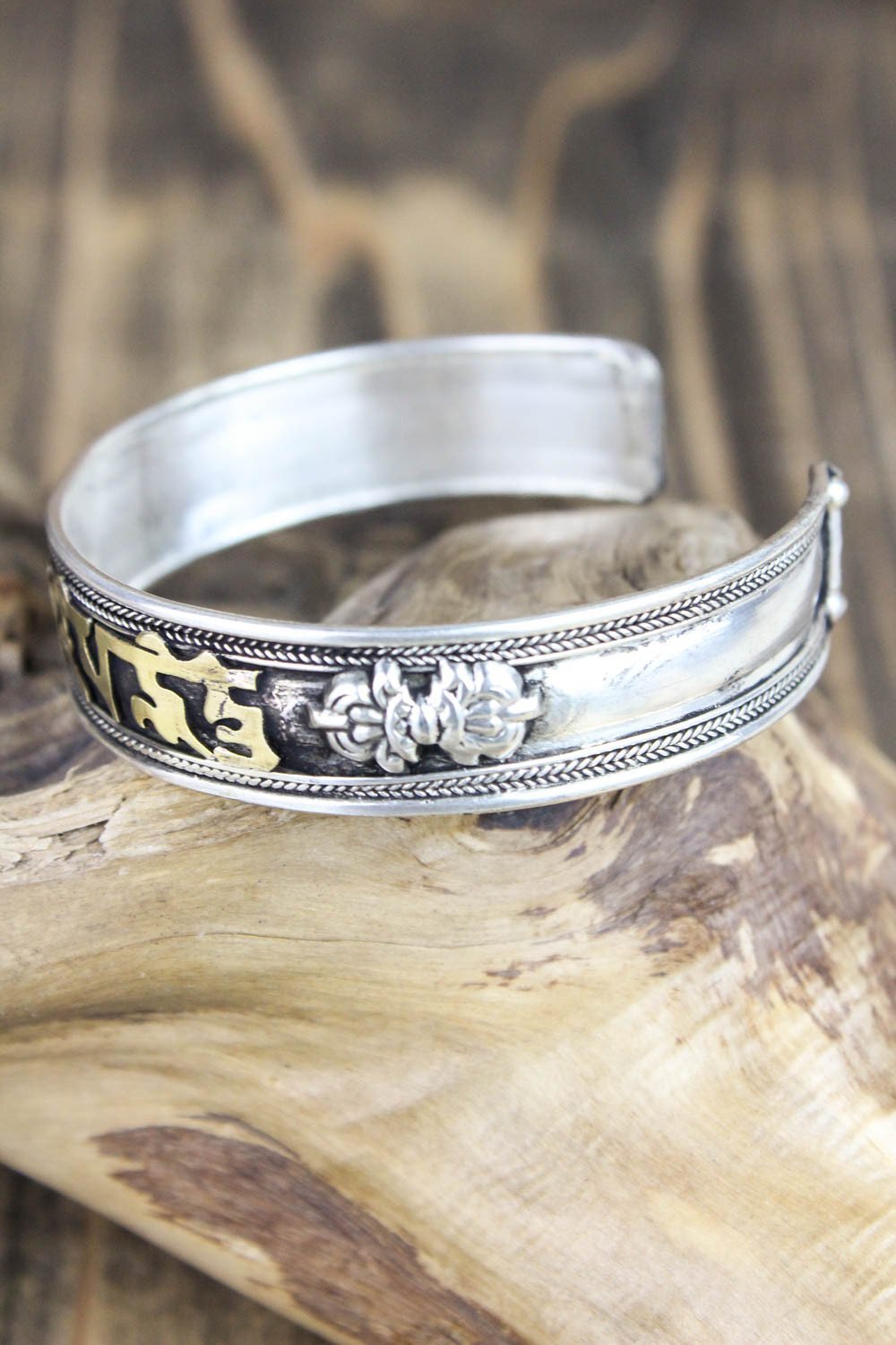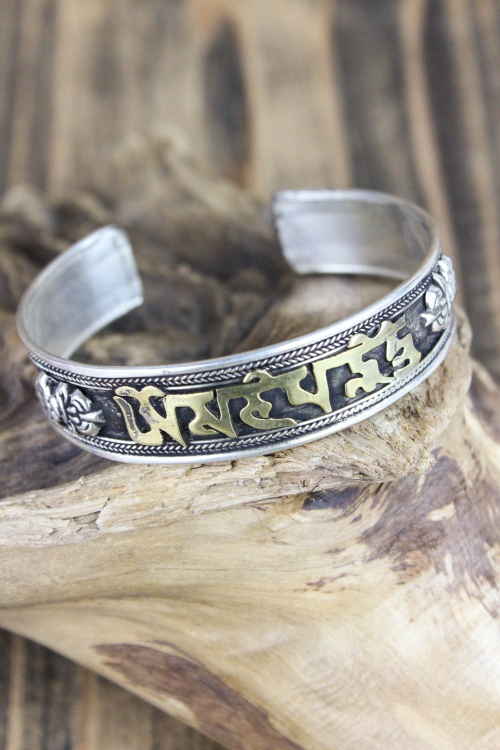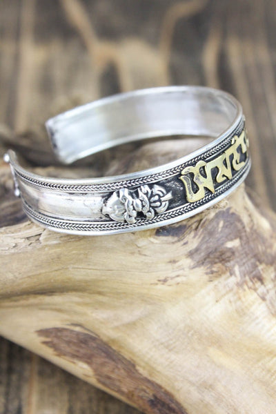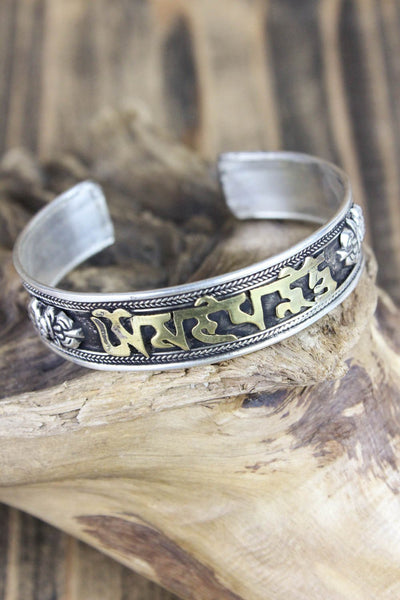 Esta pulsera de metal blanco totalmente ajustable está fabricada en Nepal y presenta el mantra de la compasión, "om mani padme hung" en escritura tibetana. El mantra invoca la poderosa atención benévola y las bendiciones de Chenrezig, la encarnación de la compasión. Esta pulsera de metal blanco bañado en plata con letras de latón también incluye un símbolo dorje a cada lado del mantra. Simbólicamente, un dorje representa el "rayo de la iluminación". Una vez "iluminado", el observador puede desapegarse de la importancia personal del dinero, el romance, la comida e incluso la vida misma.