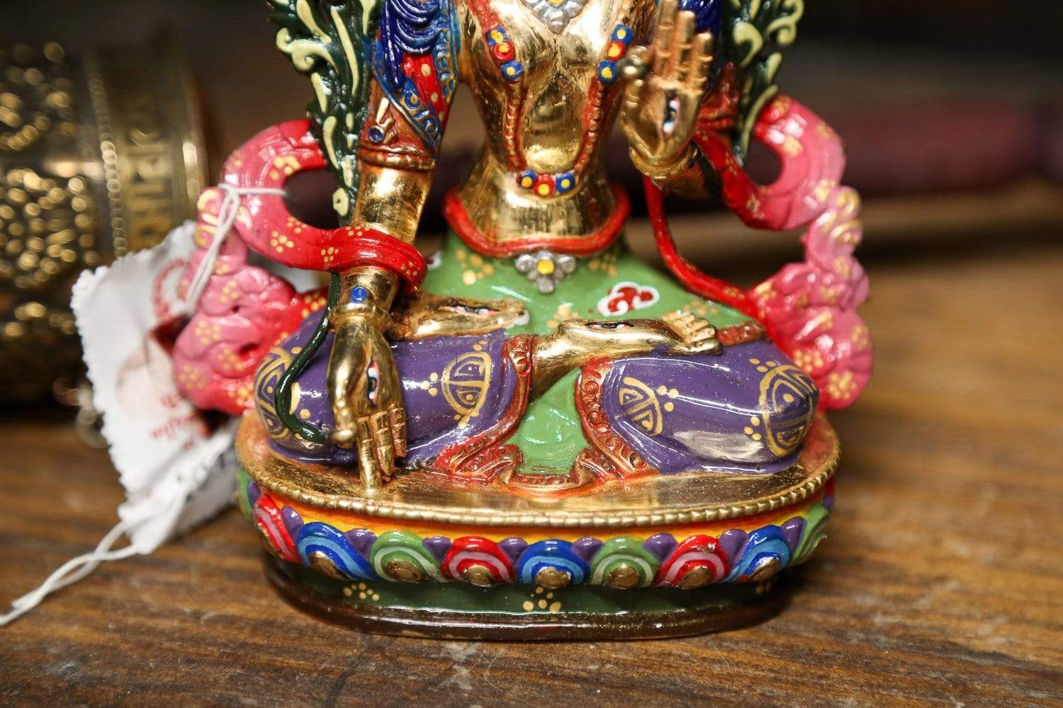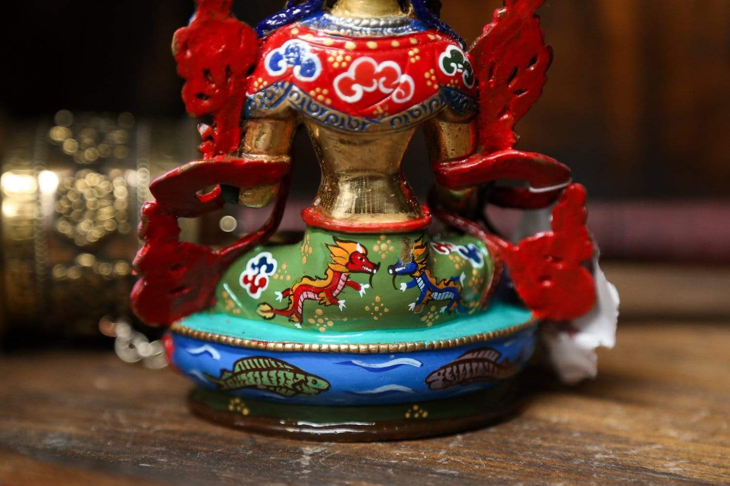 Cada estatua está llena de coloridos detalles pintados, incluidos dragones tibetanos y peces nadando. Los dragones tibetanos son protectores del budismo cuyas voces atronadoras nos despiertan del engaño. La estatua presenta un pequeño desgaste en la parte posterior y el precio se ha descontado para reflejar esta pequeña imperfección.