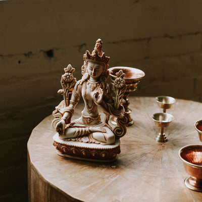 White Tara es la encarnación de la curación, la compasión y la sabiduría. Con sus siete ojos ella ve todo el sufrimiento y tiene la sabiduría y la guía que te ayudarán en tu práctica. A menudo se la conoce como la "Tara veloz" y es conocida por brindar un rápido alivio al sufrimiento.