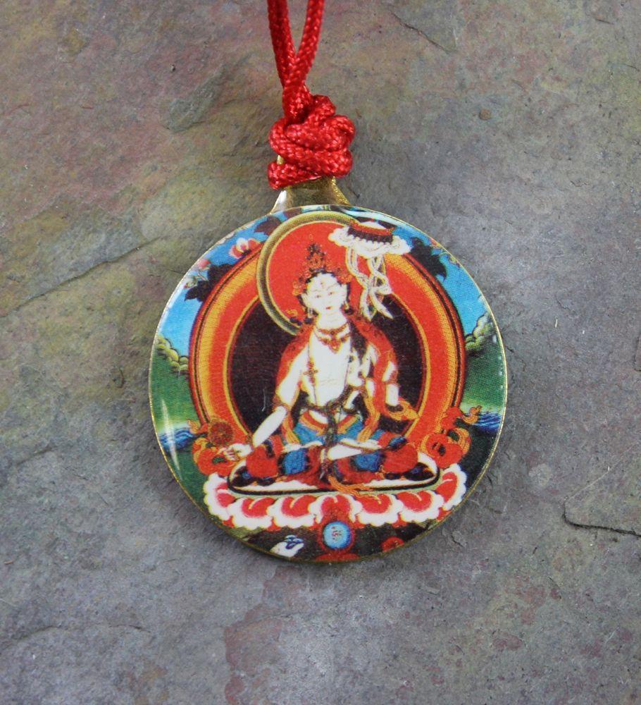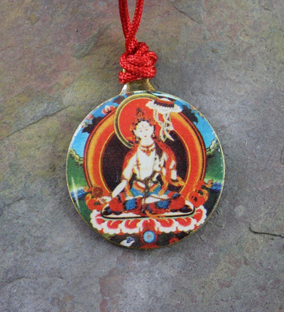 Un colgante de latón sencillo y fresco con Tara blanca en un lado y el kalichakra en el otro.