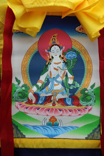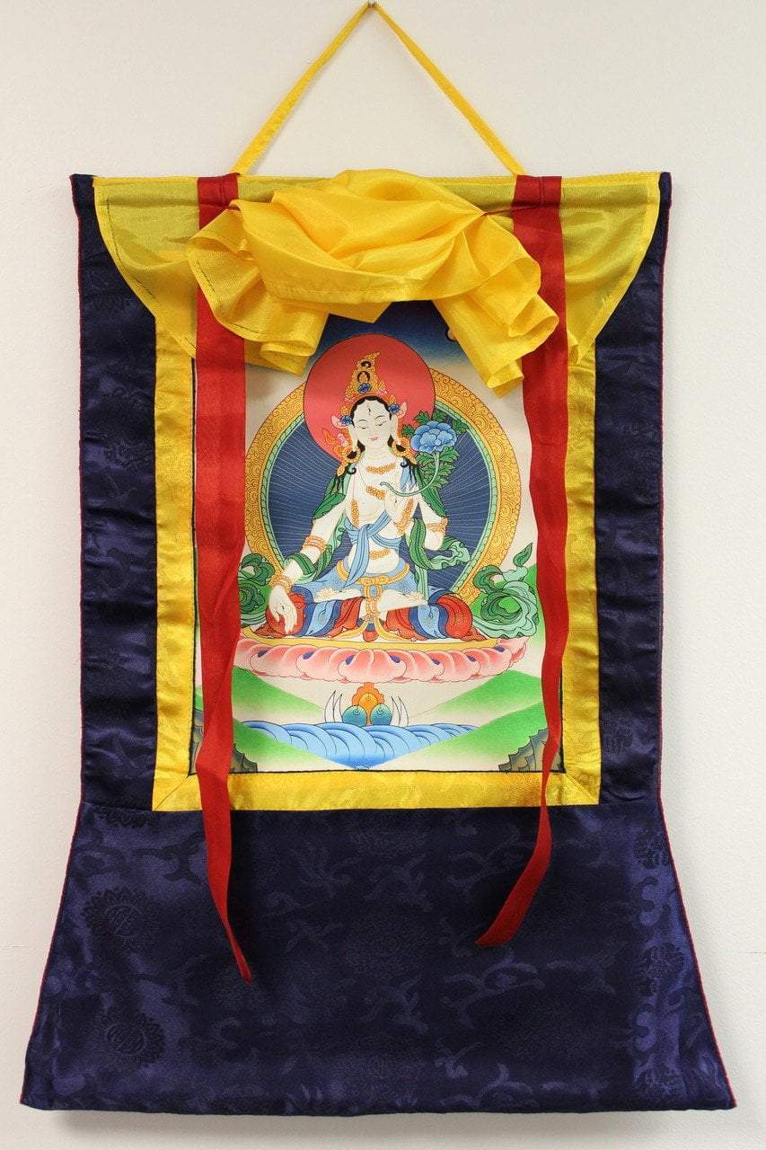 White Tara es una emanación de Tara que está relacionada con la longevidad. Se le pide salud, fuerza y longevidad. Su color blanco indica pureza, pero también indica que ella es la Verdad completa e indiferenciada. Lleva los adornos del Bodhisattva. Tiene siete ojos: los dos ojos habituales, más un ojo en el centro de la frente y ojos en las manos y los pies. Estos indican que ella ve todo sufrimiento y todos los gritos de ayuda, incluso en el mundo humano, incluso en los mundos del dolor, utilizando medios de percepción tanto ordinarios como psíquicos o extraordinarios. Lleva lotos diurnos.