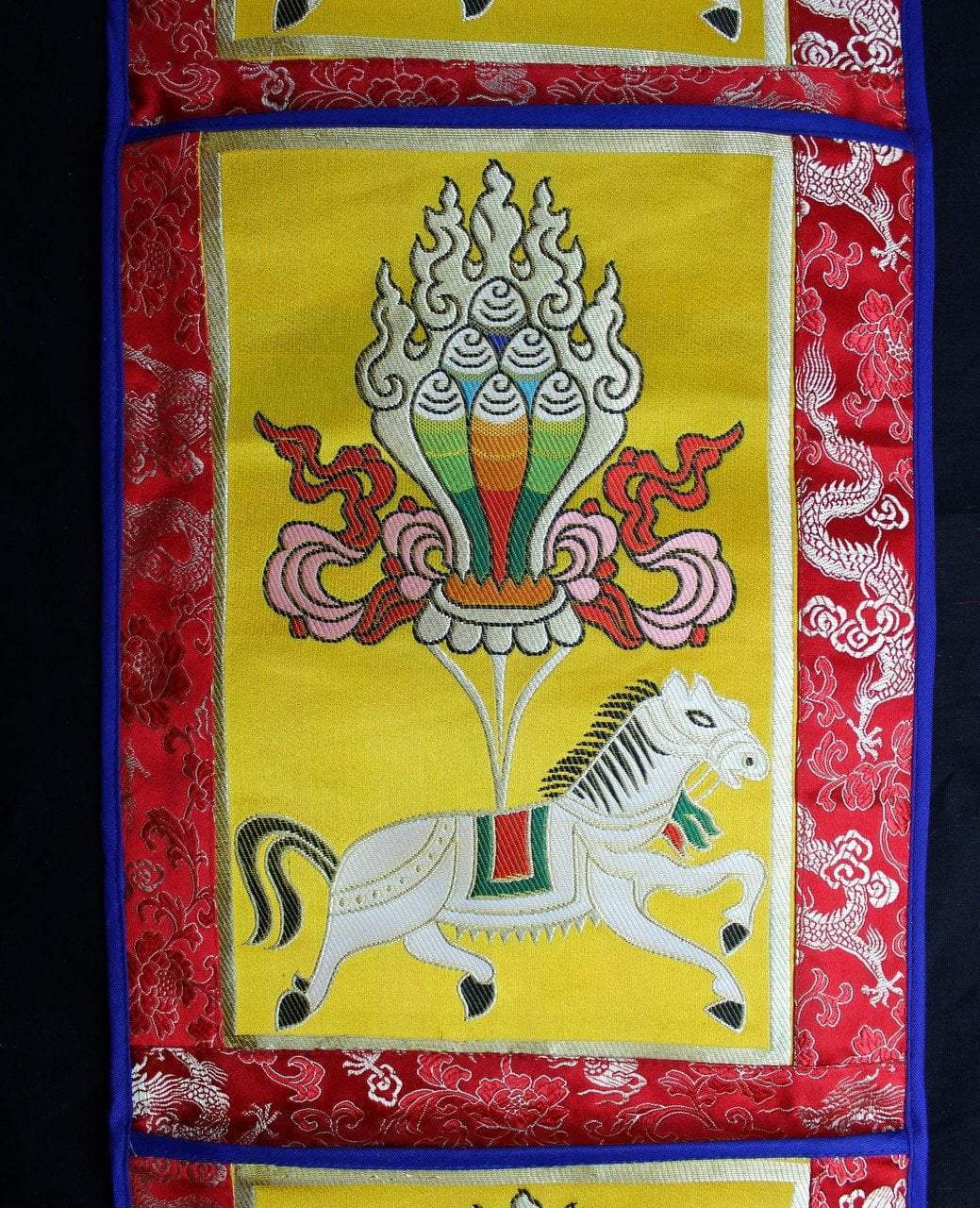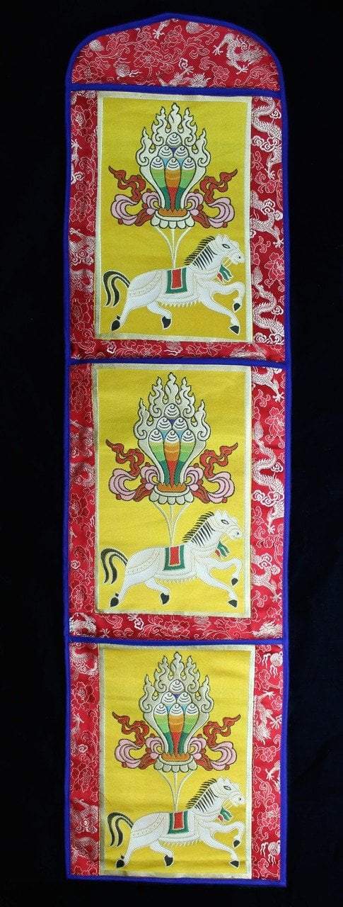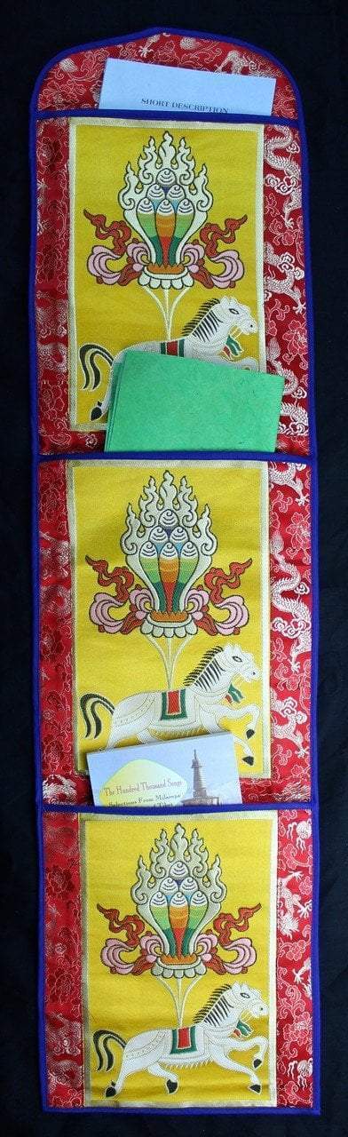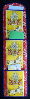 Precioso colgante de pared que contacta con 3 compartimentos para guardar cartas y correo. Presenta brocado rojo y caballos de viento.