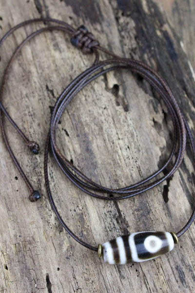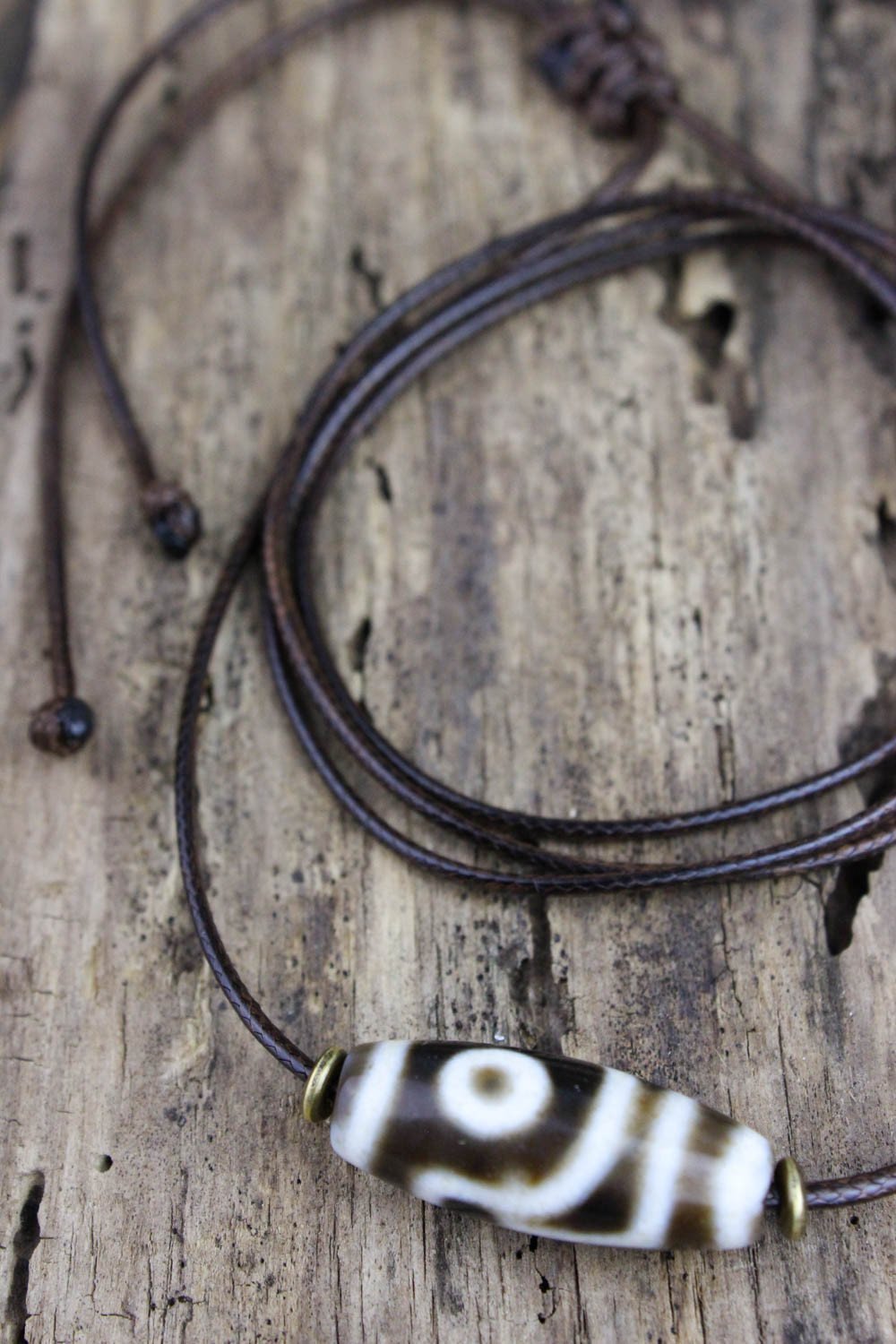 True agate 2 eye dzi bead strung with brass findings on cotton cord. Adjustable. 1 inch long bead