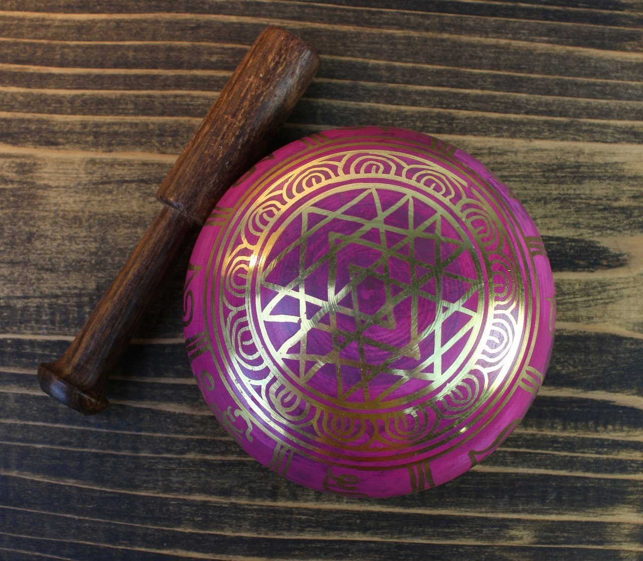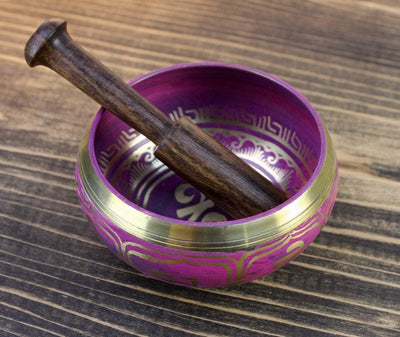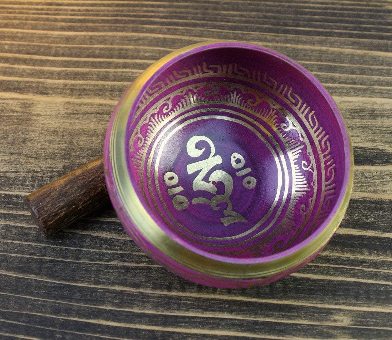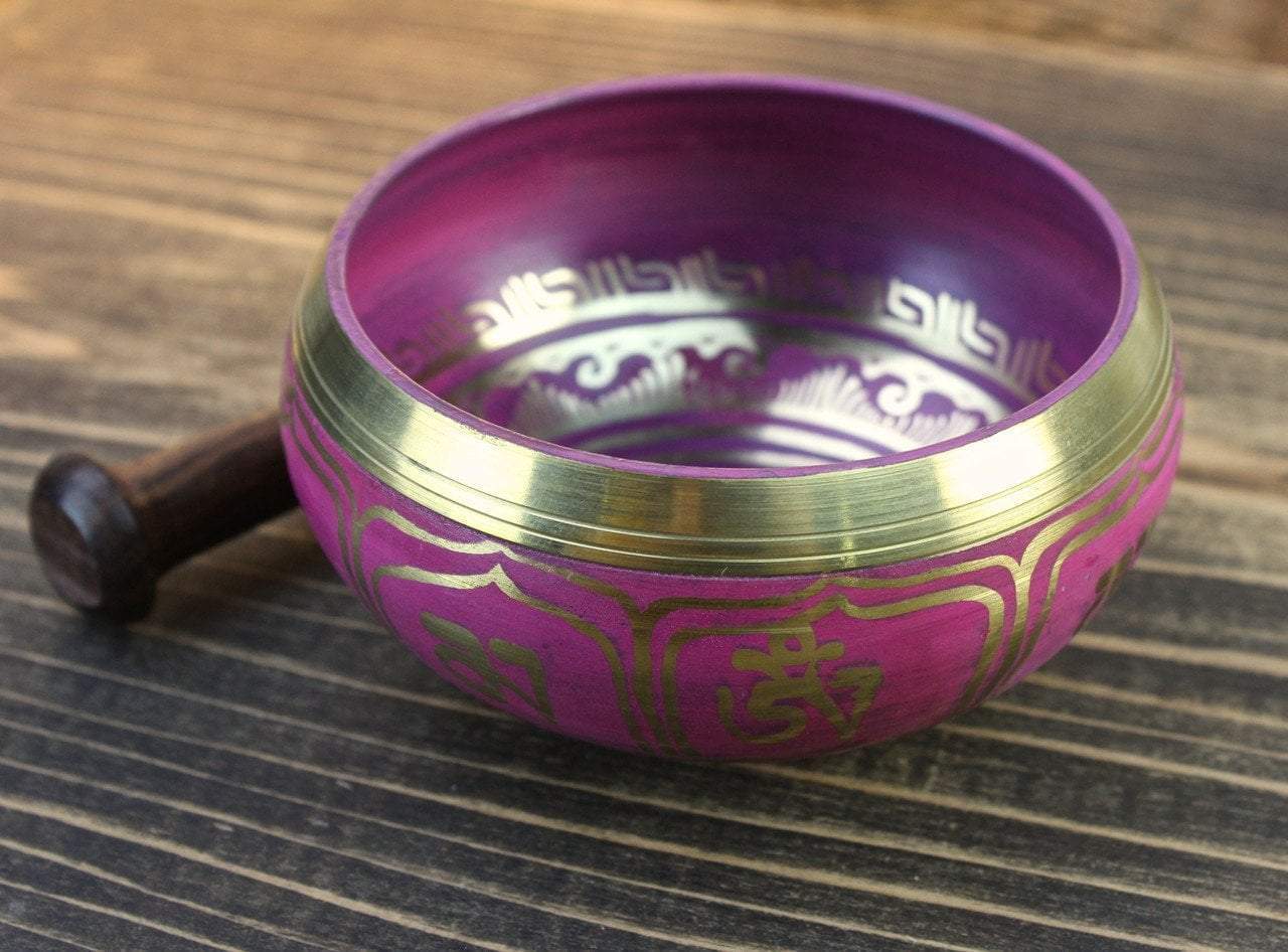 This gorgeous and colorful singing bowl is hand painted by an artisan in Nepal with 14K gold. The outside of the bowl is decorated with the Om Mani Padme Hum mantra in lotus petals, with the seed, Hrih, in the middle. Hrih, is the seed syllable of Amitabha.