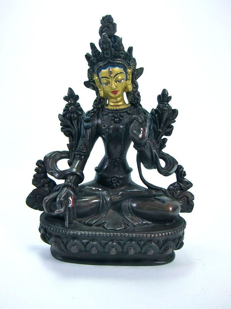White Tara has 7 eyes and here each is hand-painted with amazing detail. Her face is also painted with lovely detail. She is cast in resin then hand wrapped in copper and painted in 24c gold in Nepal. White Tara is known for longevity, compassion, and healing.
