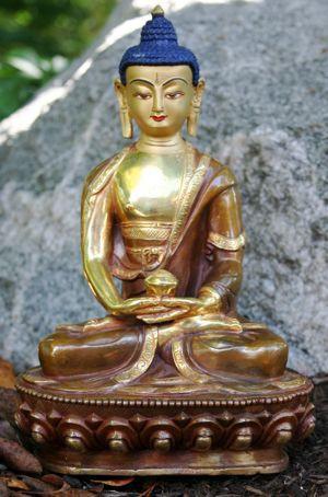 This beautiful bronze statue is cast using the Lost Wax method, with gold painting. The painted details on this Amitabha Buddha's face are beautiful. We hand select these statues one-at-a-time from a family in Nepal who have been statue-makers for dozens of generations. Bottom is removable for consecration.