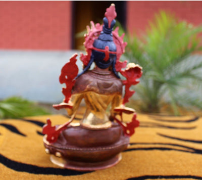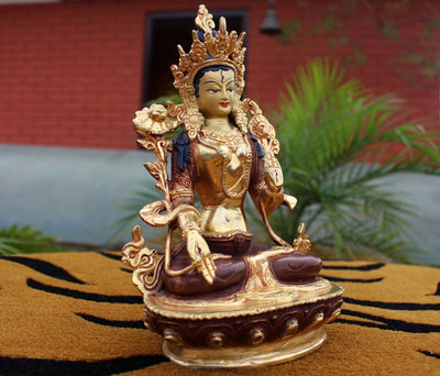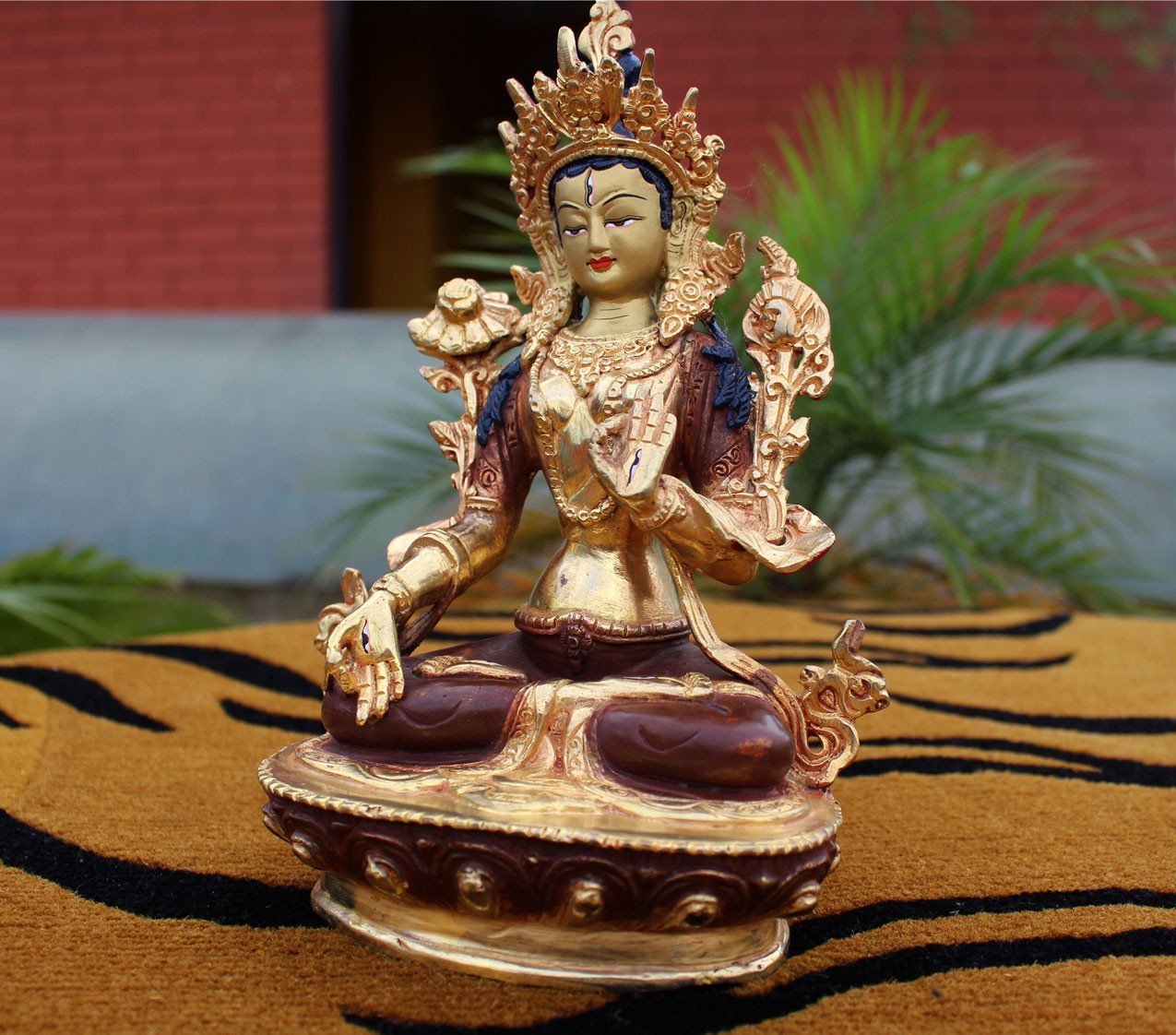 Bronze statue, cast using the Lost Wax method, with gold painting. The painted details on this tara's face are beautiful. These statues have been selected by Prajwol in Nepal. He has been coordinating with our fourth generation statue-makers in Lalitpur. Bottom is removable for consecration.