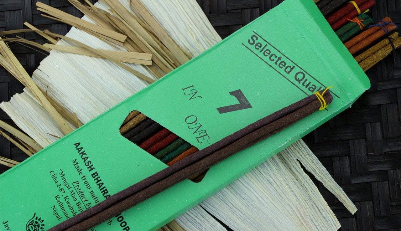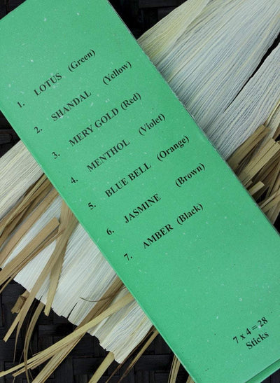 Seven fresh fragrances made from the following natural herbs: Lotus (green), Shandal (yellow), Mery Gold (red), Menthol (violet), Blue Bell (orange), Jasmine (brown) and Amber (black).  Hand made in Kathmandu, Nepal.