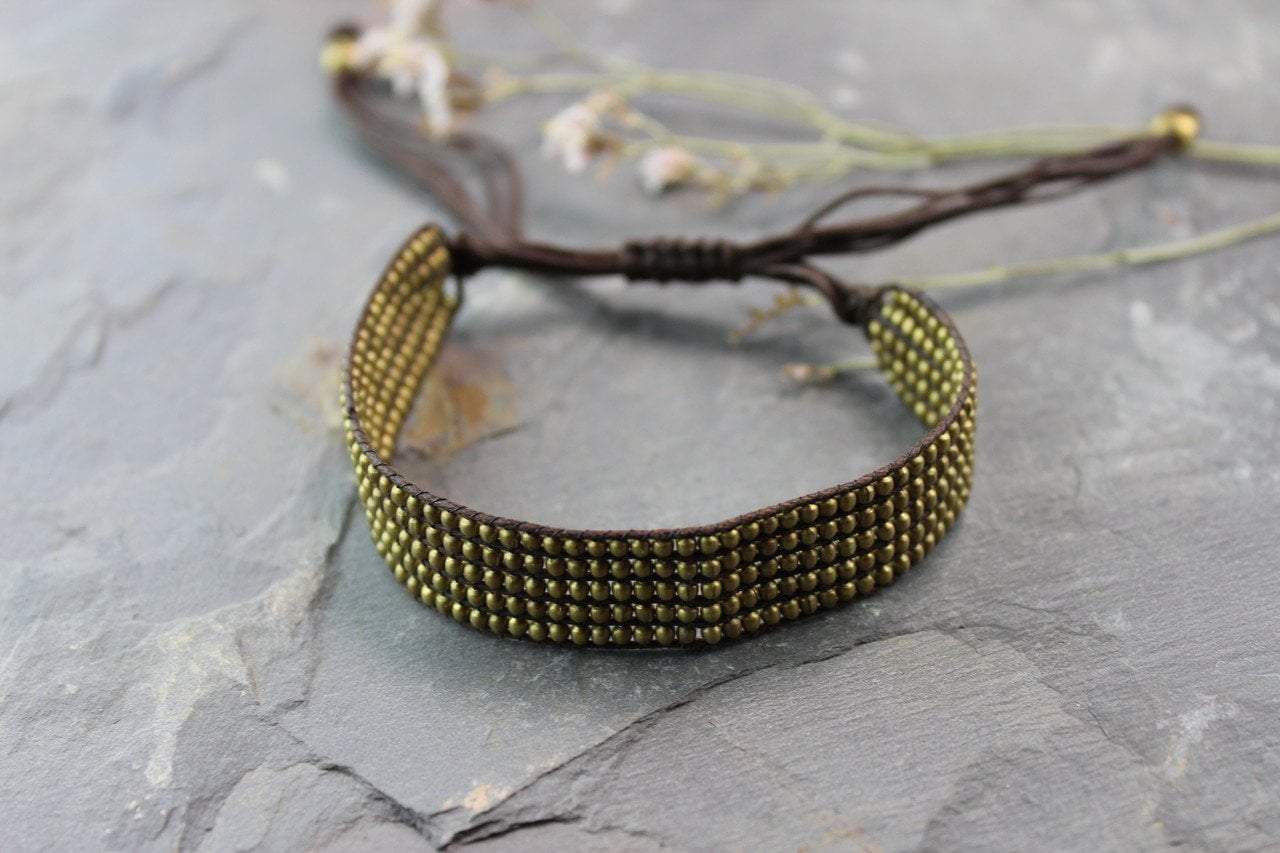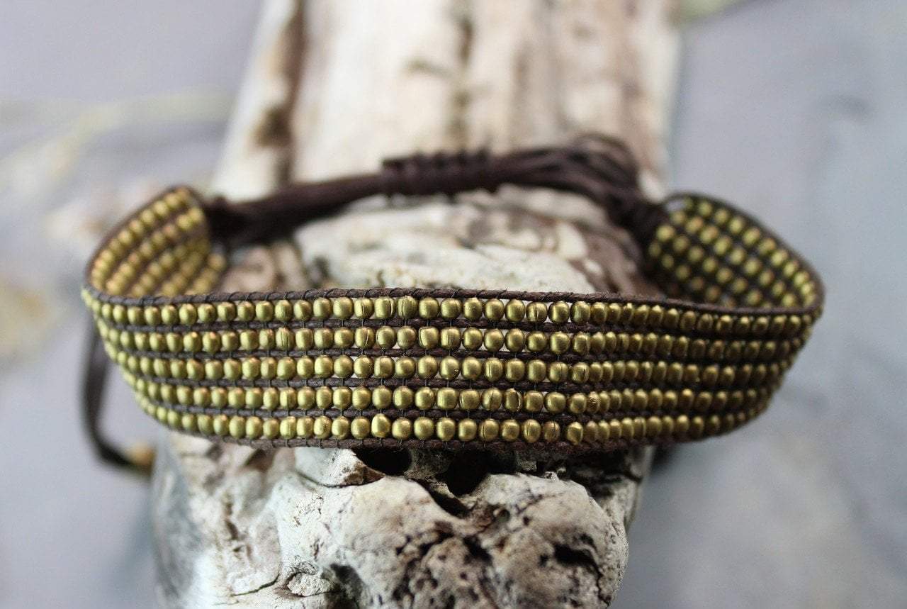 This trendy bracelet is small enough for everyday wear, but bold enough to spice up any plain look! Wear it stacked with other bracelets or alone and it's sure to turn heads. Each and every bead is hand strung by artisans in Nepal who have learned the art of beading through generations of tradition. Brass beads on brown cotton cord.