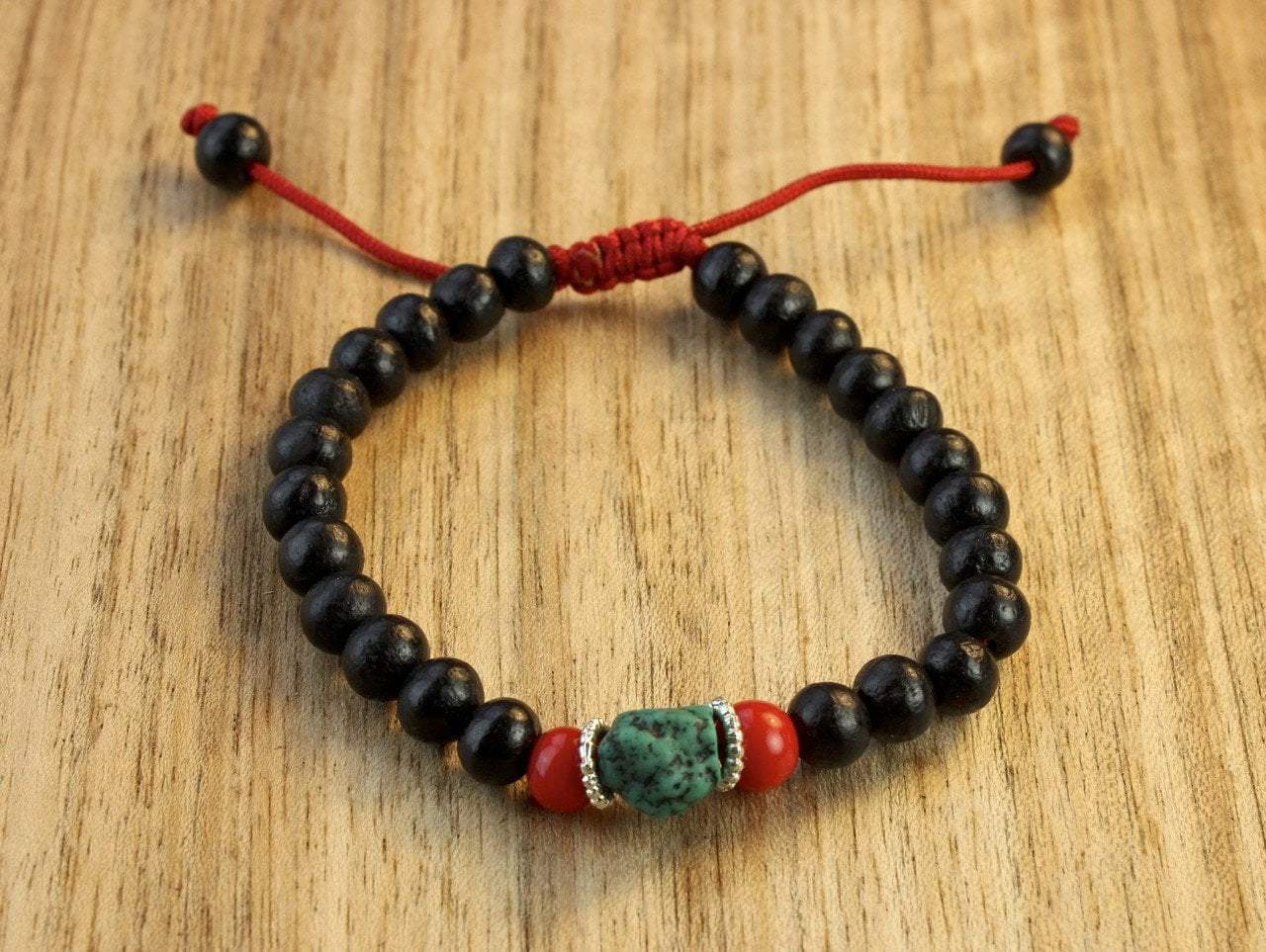 This beautiful rosewood wrist mala has a turquoise resin bead and bright red coral spacer beads. The simple red tassel makes this one of our favorites. Strung on durable cord, it is adjustable to fit most wrists. This is an especially good choice for smaller hands.
