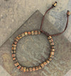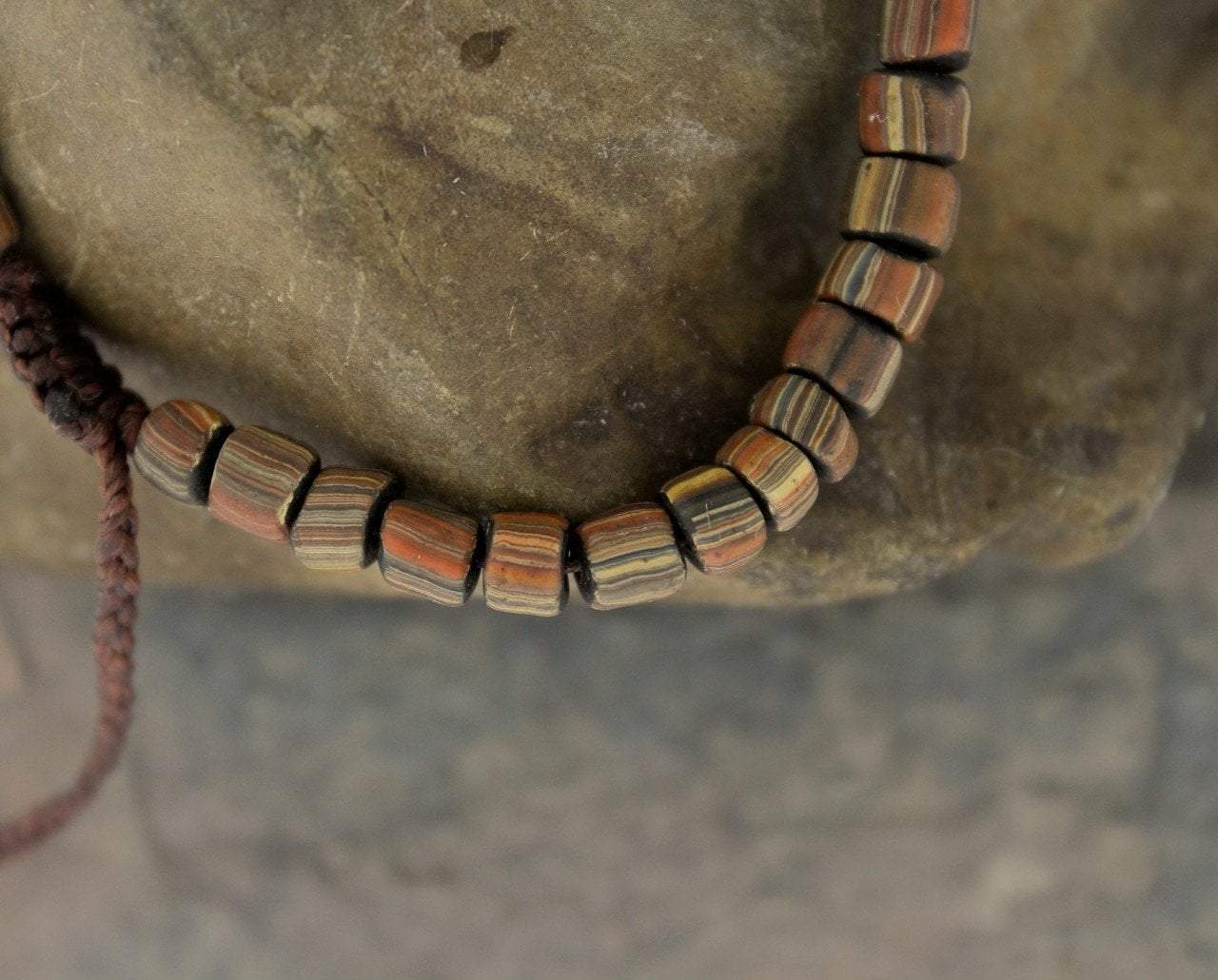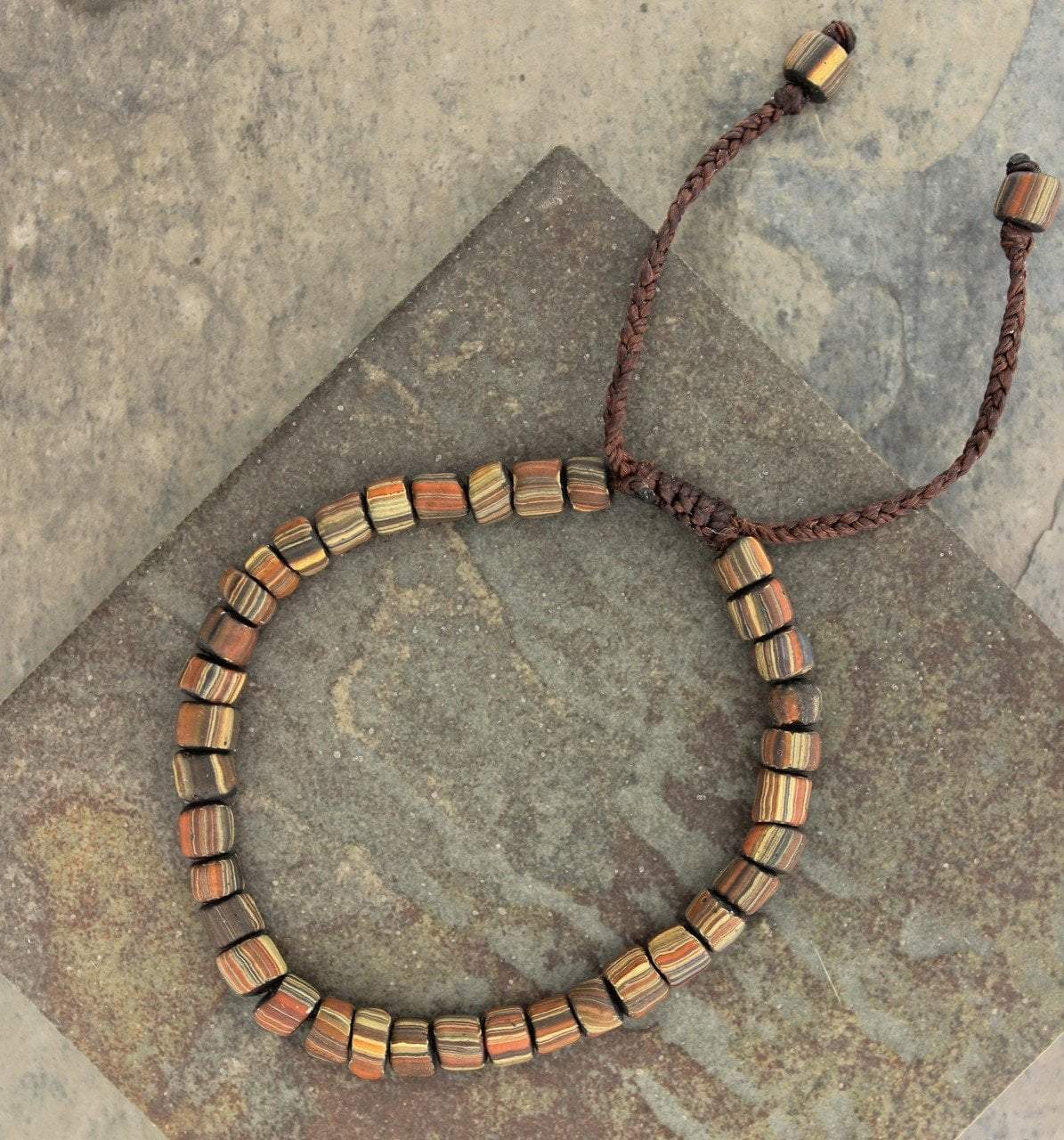 African Glass Bead Bracelet on dark brown cord.