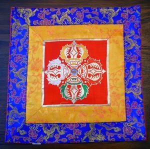 This is a great hand sewn cloth for a home altar or meditation space. Use on a table top or altar area to place underneath statues, stupas, and/or offering bowls. Altar cloth features a beautifully embroidered double dorje design on a red background that is traditionally framed in yellow and blue brocade. Handmade in Nepal.