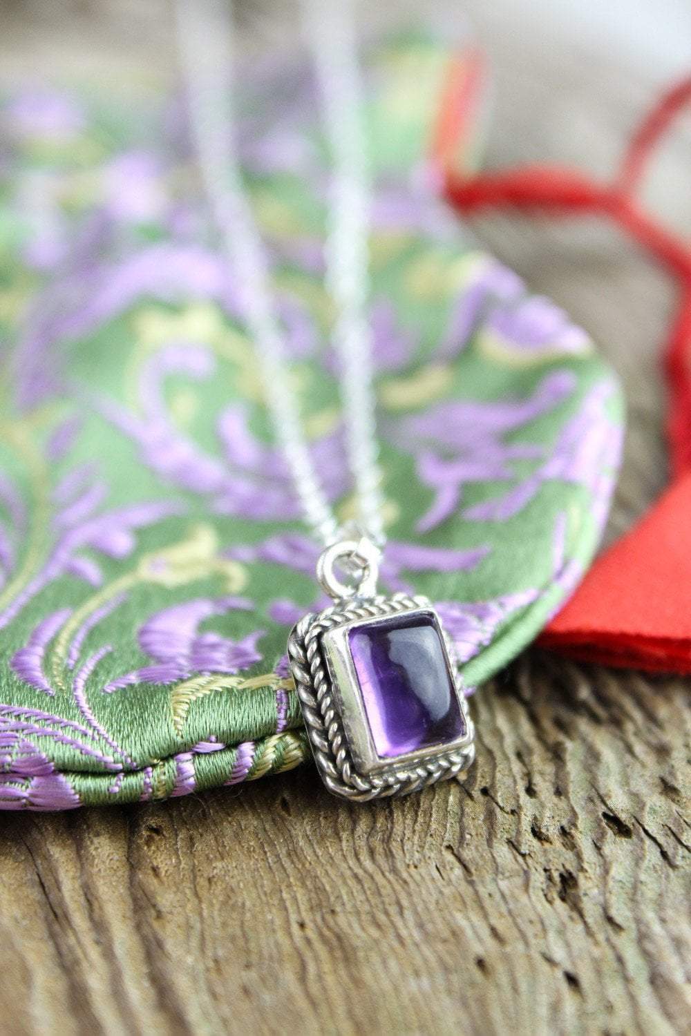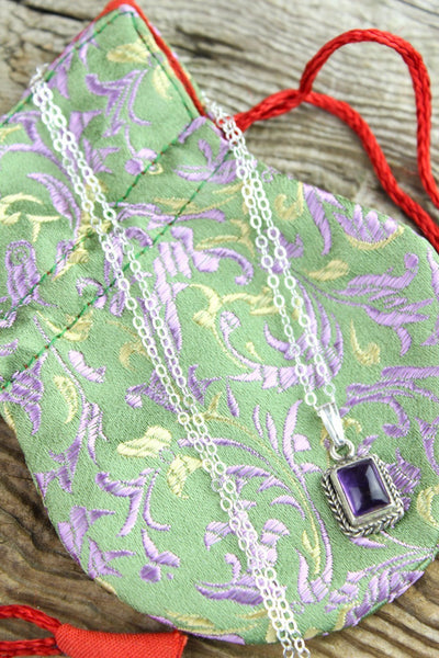 New and exclusive DharmaShop necklace gift set includes a rectangular sterling silver and Amethyst charm, hand strung on an 18 inch silver flat chain.  This beautiful and dainty charm necklace comes inside of a small, handmade, 100% cotton mala bag decorated with intricate leaf designs.  Necklace wears well with both casual or formal outfits, and is perfect for the upcoming gift giving season!