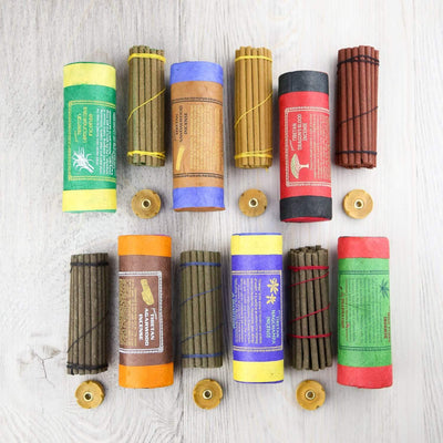 Includes about 30 sticks that measure 4 inches. Comes with a small wooden burner and is wrapped inside of an eco-friendly lokta paper tube.