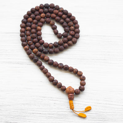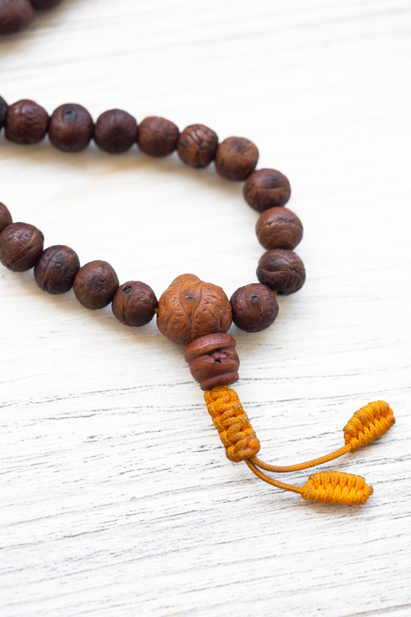 From our DharmaShop curated collection, this mala was hand selected from an antique Bodhi Seed seller just outside of the Boudhanath temple. Here you can see monks from nearby monasteries meditating with similar mala beads.