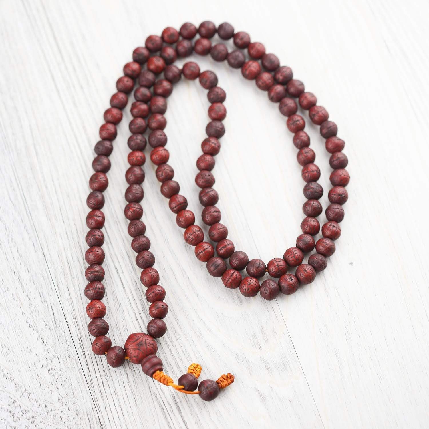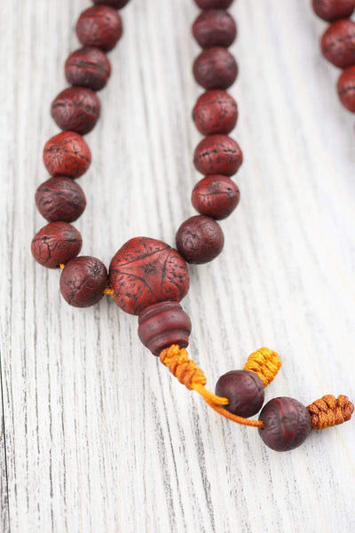 This mala comes from our DharmaShop curated collection. It was hand selected from an antique bodhi seed seller just outside of the Boudhanath temple. The bodhi seeds originate from the Kavrepalanchok District, one of the only places in Nepal so far to produce bodhi seeds! This seller and her family have been involved in the bodhi seed trade for generations. Kavrepalanchok is also the hometown of the head of our DharmaShop Nepal team!