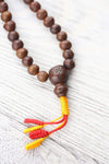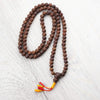 • Made of 108 small, well used bodhi beads.  Each bead is rich in color with a beautiful sheen as well as its own shape and texture.  Mala has been restrung in recent years on red cord with a yellow knot and matching ties.