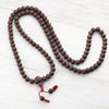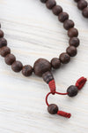 • Made of 108 small, well used Bodhi beads.  Each bead is rich in color with a beautiful sheen and texture.  These antique beads have been restrung in recent years on monks robe red cord and include an additional two beads below the guru.