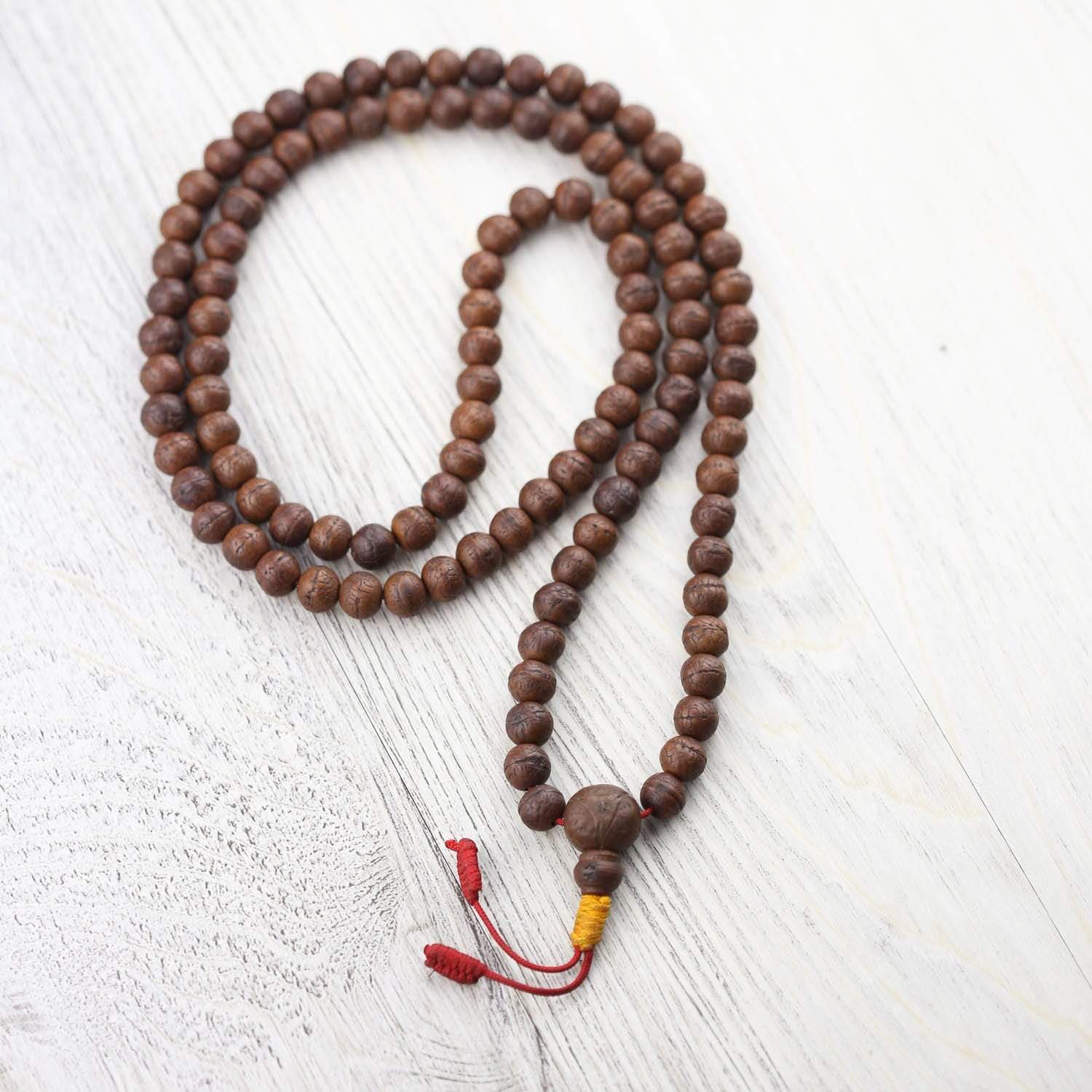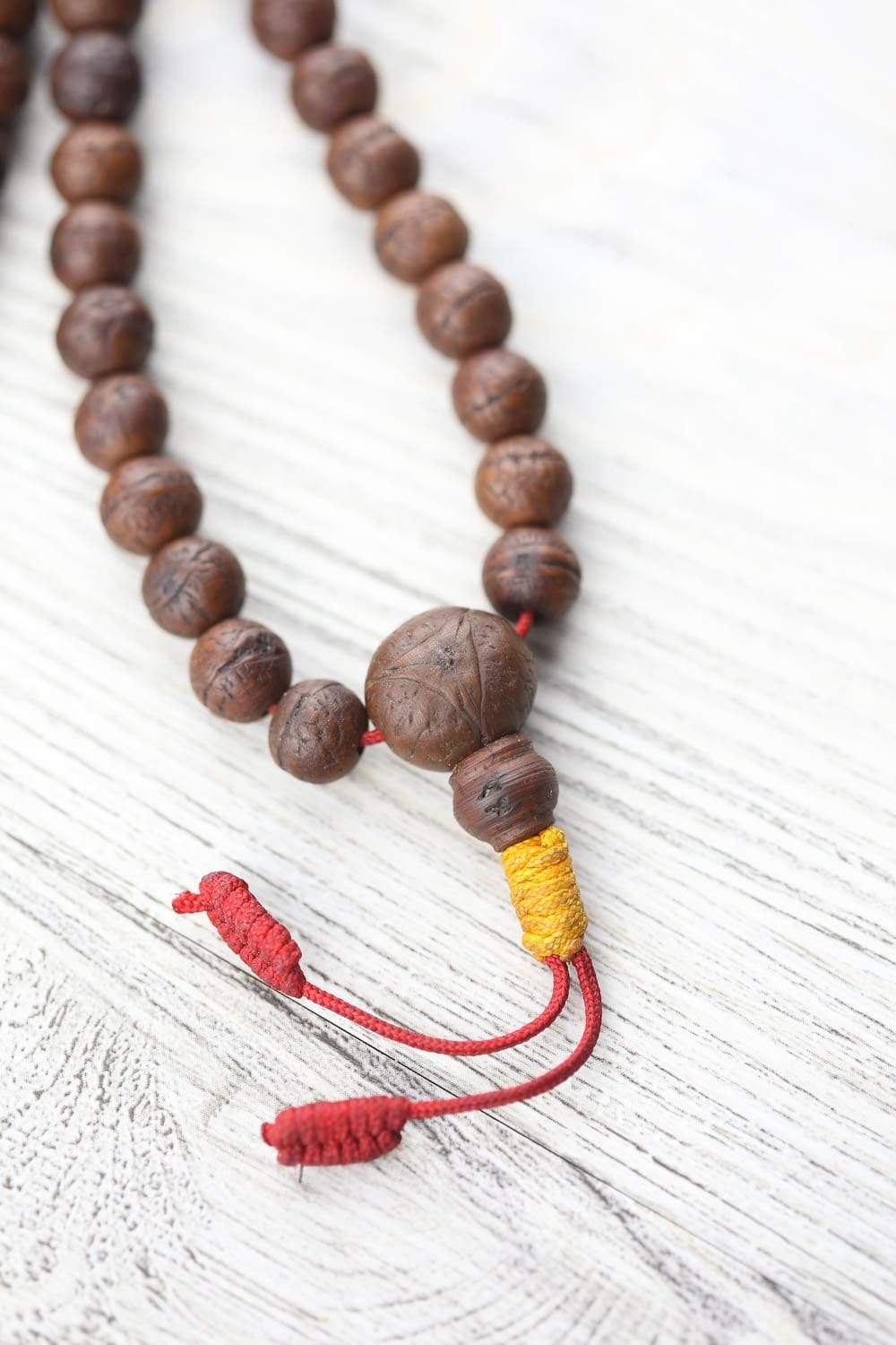 • Made of 108 small, well used and very dark bodhi beads.  Each bead is rich in detail with a beautiful sheen as well as its own shape and texture.  The mala has been restrung in recent years on red cord with a yellow knot.