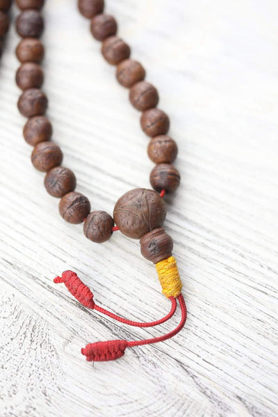 This mala comes from our DharmaShop curated collection.  It was hand selected from an antique bodhi seed seller just outside of the Boudhanath temple.  The bodhi seeds originate from the Kavrepalanchok District, one of the only places in Nepal so far to produce bodhi seeds!  This seller and her family have been involved in the bodhi seed trade for generations.  Kavrepalanchok is also the hometown of the head of our DharmaShop Nepal team!