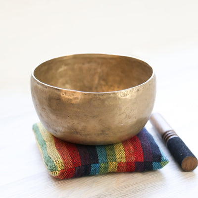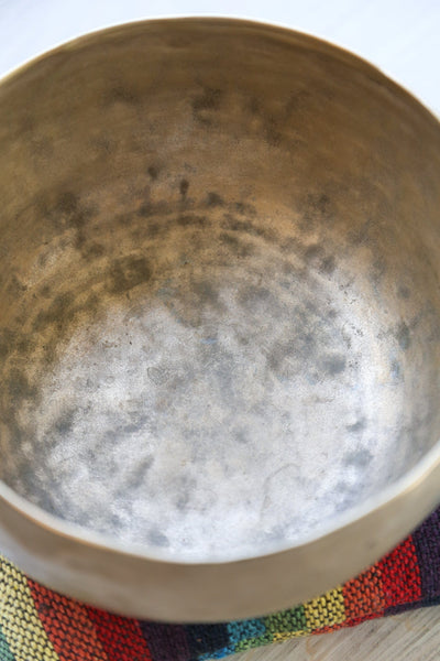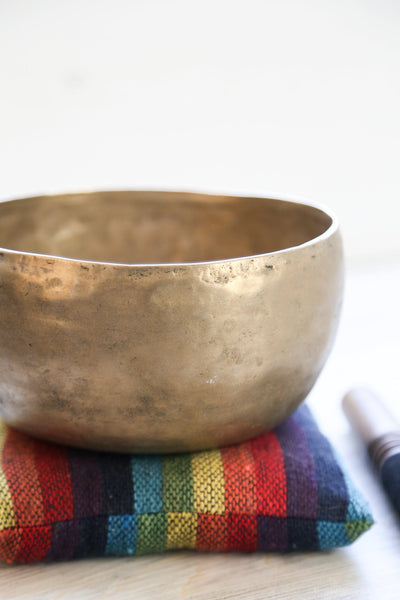 Each time we're able to get a small collection of these bowls is exciting as they are exceptional. Antique Tibetan singing bowls are highly sought after for their remarkable quality of sound, rich tones, and unique physical characteristics. Every handmade mark tells a story of the bowls history! In your hands, we know that these bowls will continue to be a lifetime heirloom, telling their story through their unique markings and golden tones.