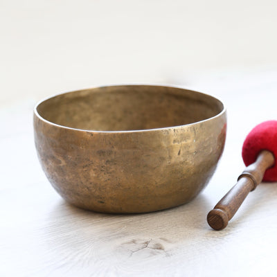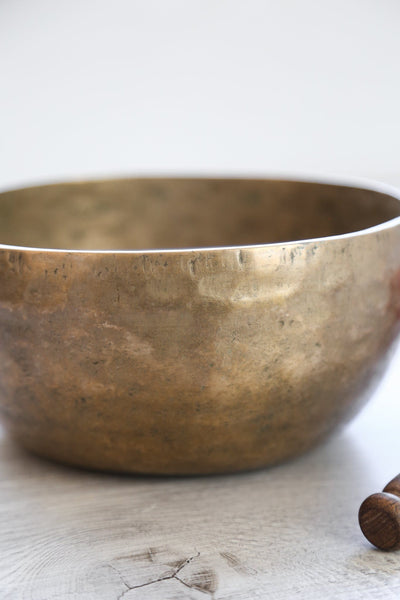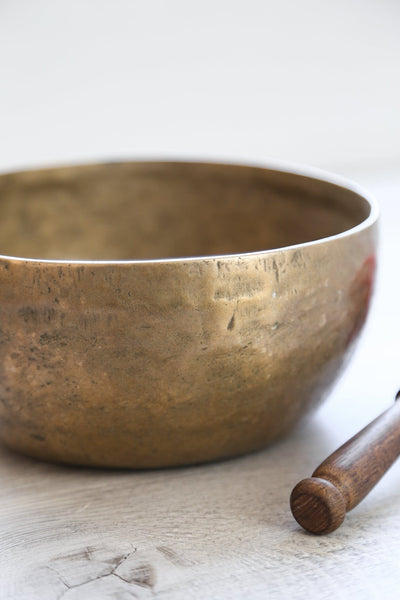Each time we're able to get a small collection of these bowls is exciting as they are exceptional. Antique Tibetan singing bowls are highly sought after for their remarkable quality of sound, rich tones, and unique physical characteristics. Every handmade mark tells a story of the bowls history! In your hands, we know that these bowls will continue to be a lifetime heirloom, telling their story through their unique markings and golden tones.