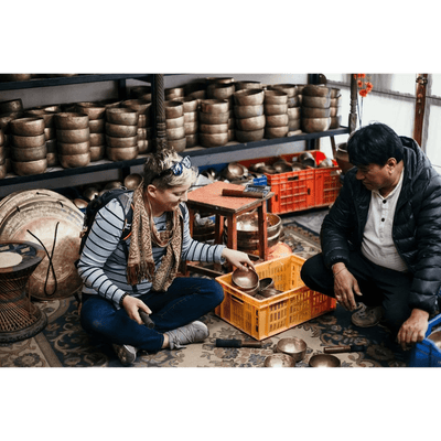 Each one of these amazing Tibetan bowls are hand picked by the DharmaShop team in Nepal. They are some of the highest quality antique bowls we've had in our collection. Hand selected for quality and sound from an amazing collection of old bowls acquired from one of our favorite singing bowl collectors and sound therapy practitioners in Kathmandu. Check out the photos to see a picture of our team picking out bowls with our friend in Kathmandu!