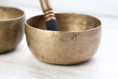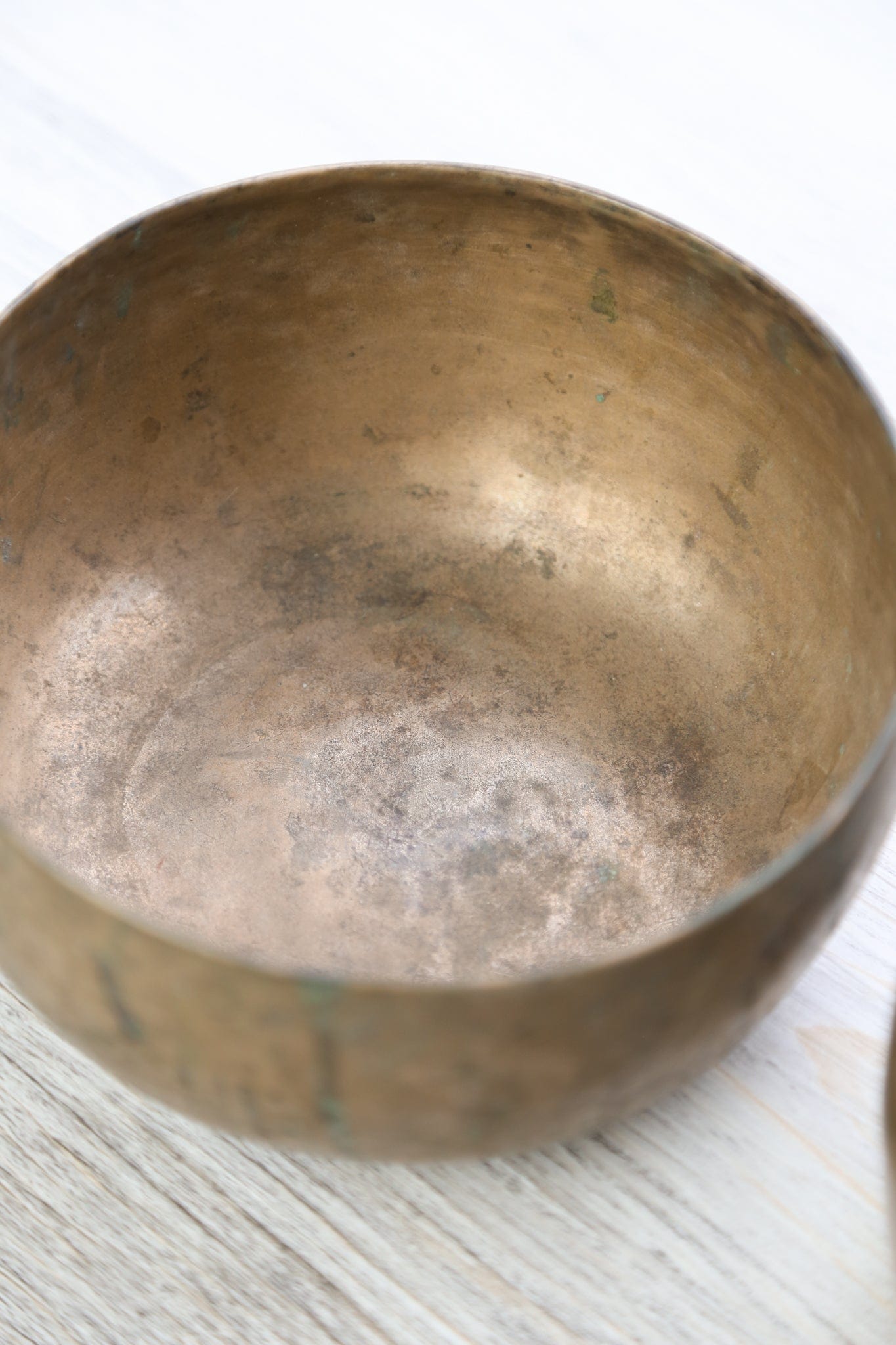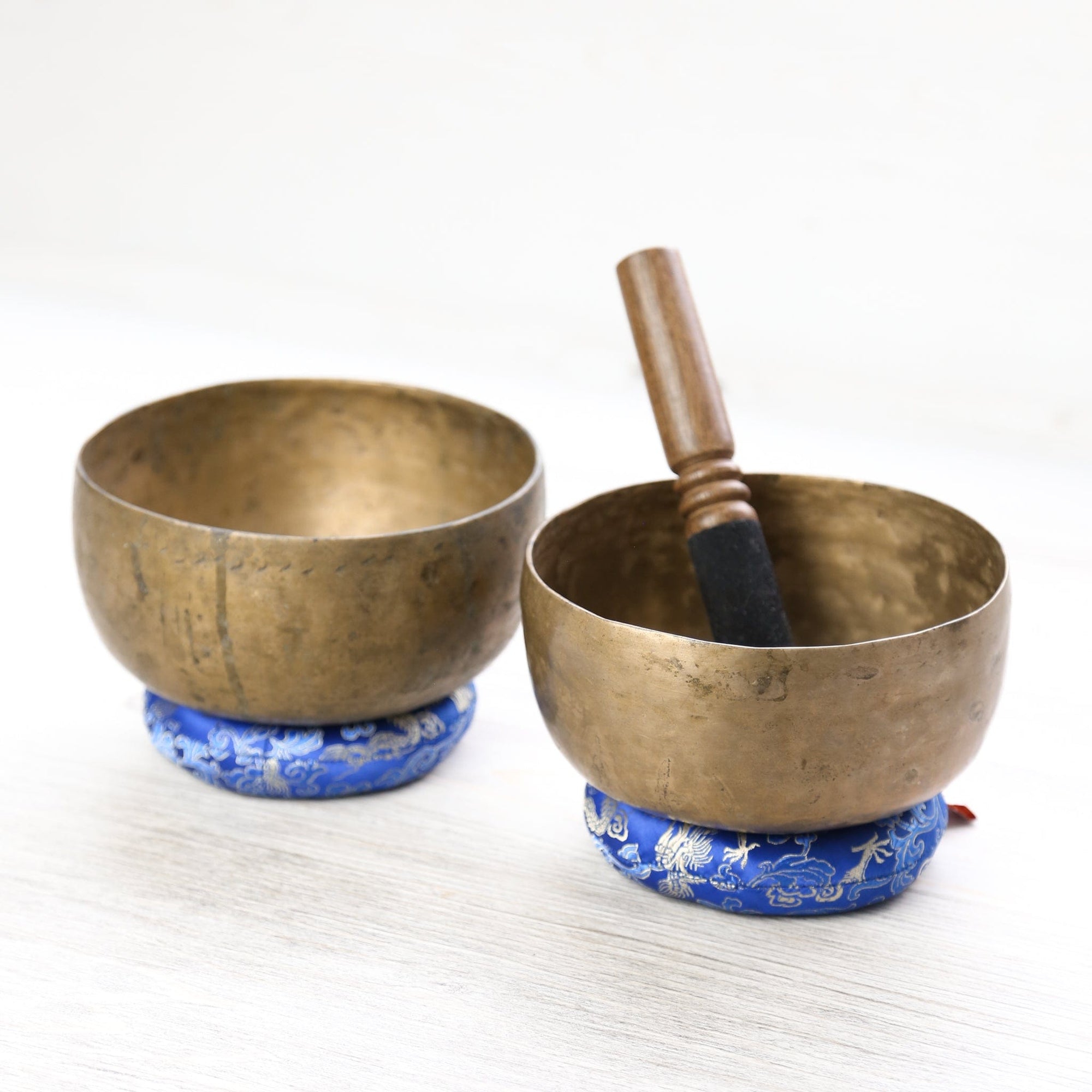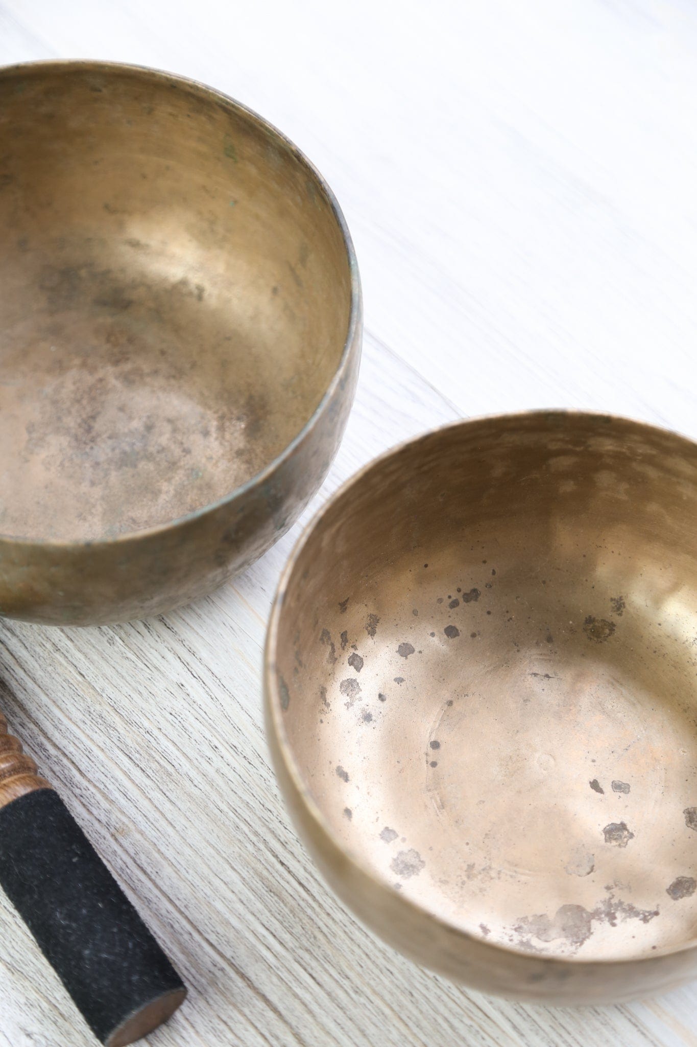• We played through dozens of our one-of-a-kind antique meditation bowls and chose these two based on the quality of tone and overall sound of each bowl played together as a set.