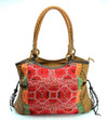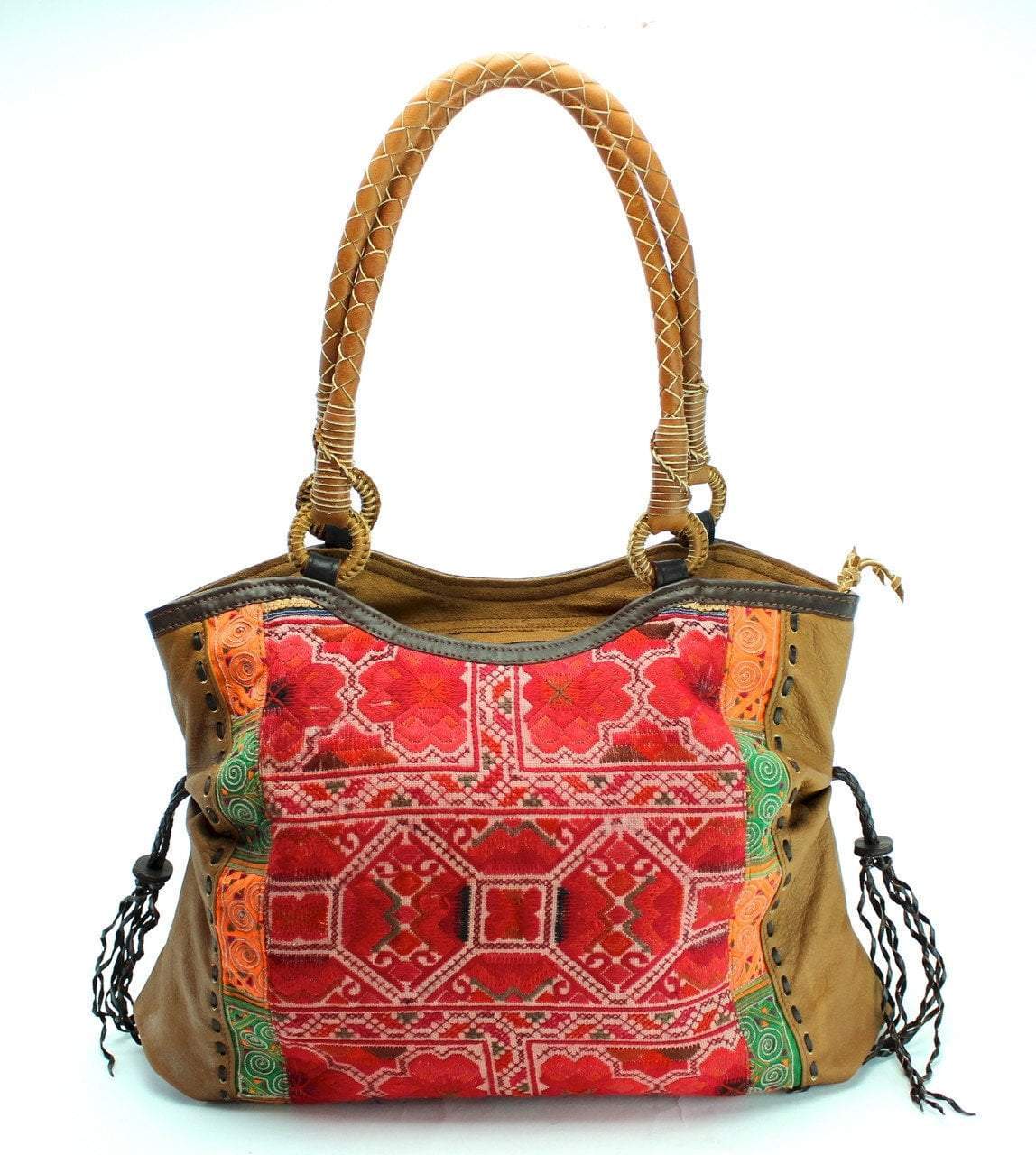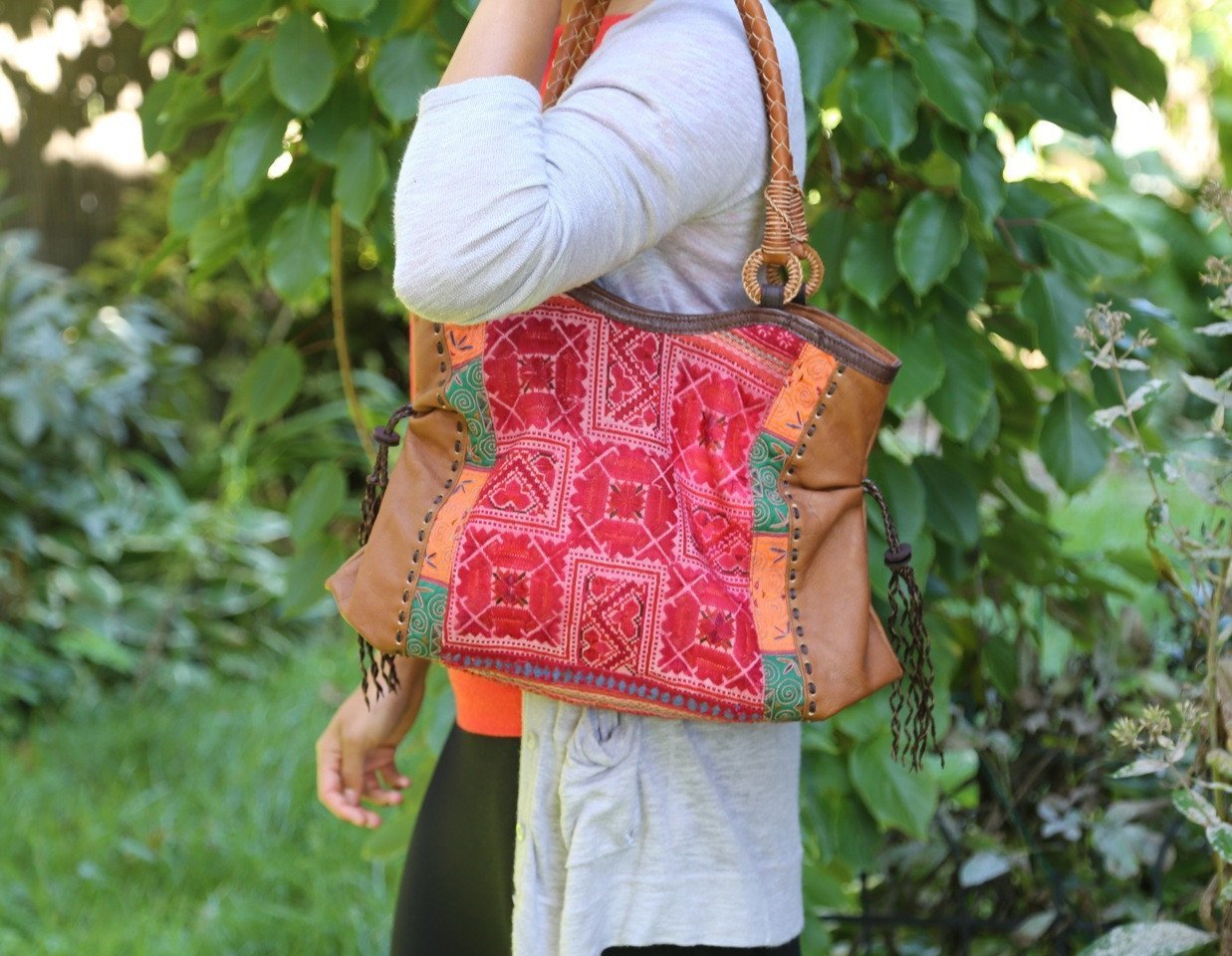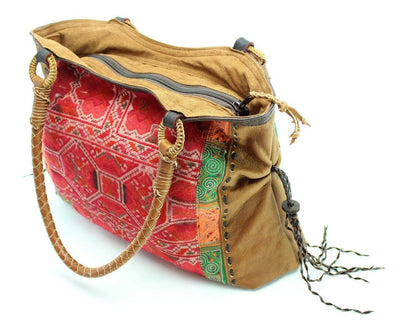 One-of-a-kind. We ordered a few of these from our friends who travel in Thailand and work with fiber artisans and all of them have disappeared to family and friends! They are simply gorgeous. The fabric is recycled tapestry and embroidered, textured cottons with just a hint of shine and sparkle. This exact purse has a beautiful deep red kaleidoscopic floral pattern, though different on each side. The soft leather trim is two shades of brown, complimenting each other perfectly. One of the best features of this bag are the soft, braided leather handles. They are super comfortable and wear perfectly. Inside you will find one zipper pocket and two smaller pockets perfect for keys, wallet, and phone. Whole bag also has zip closure. Lined with suede-cloth.