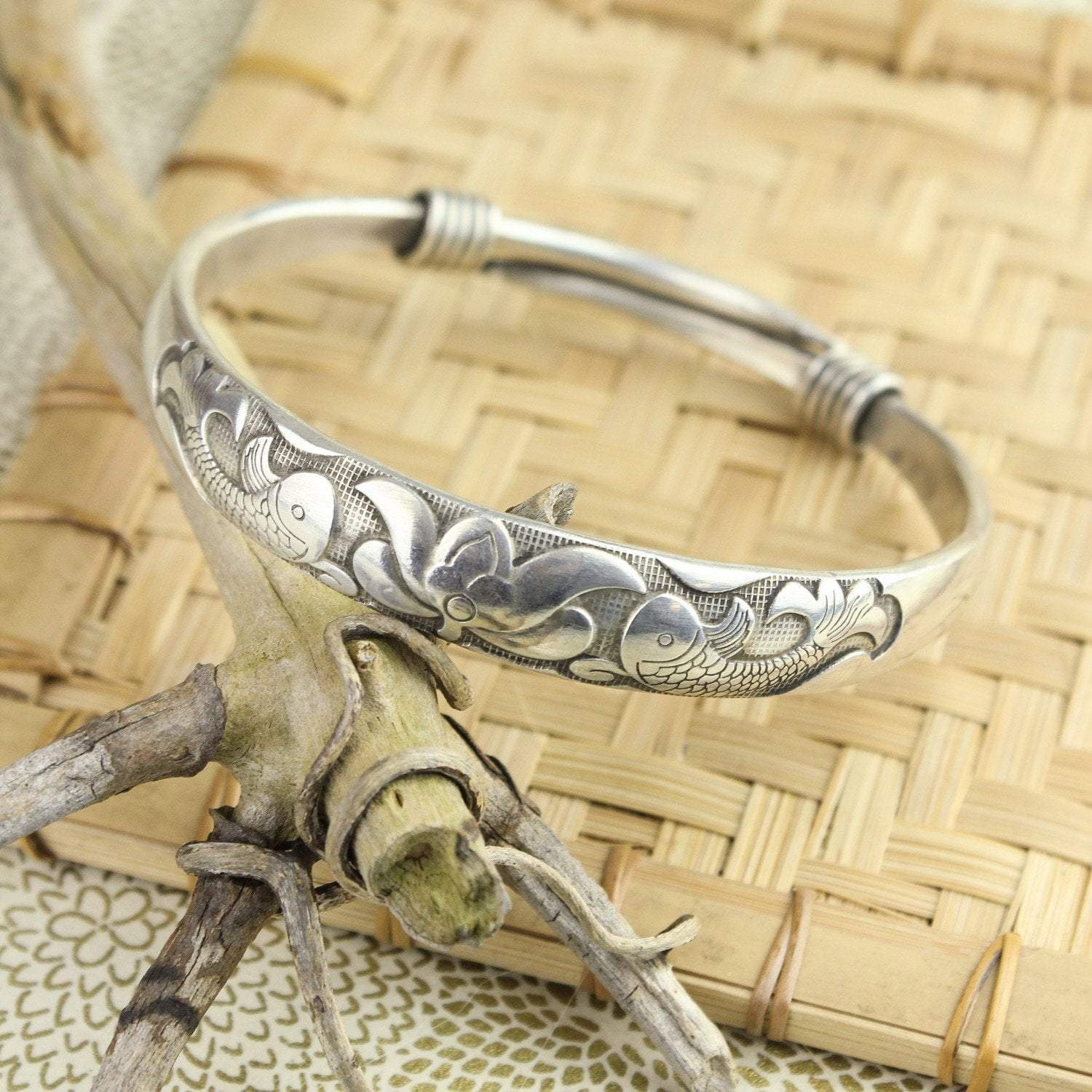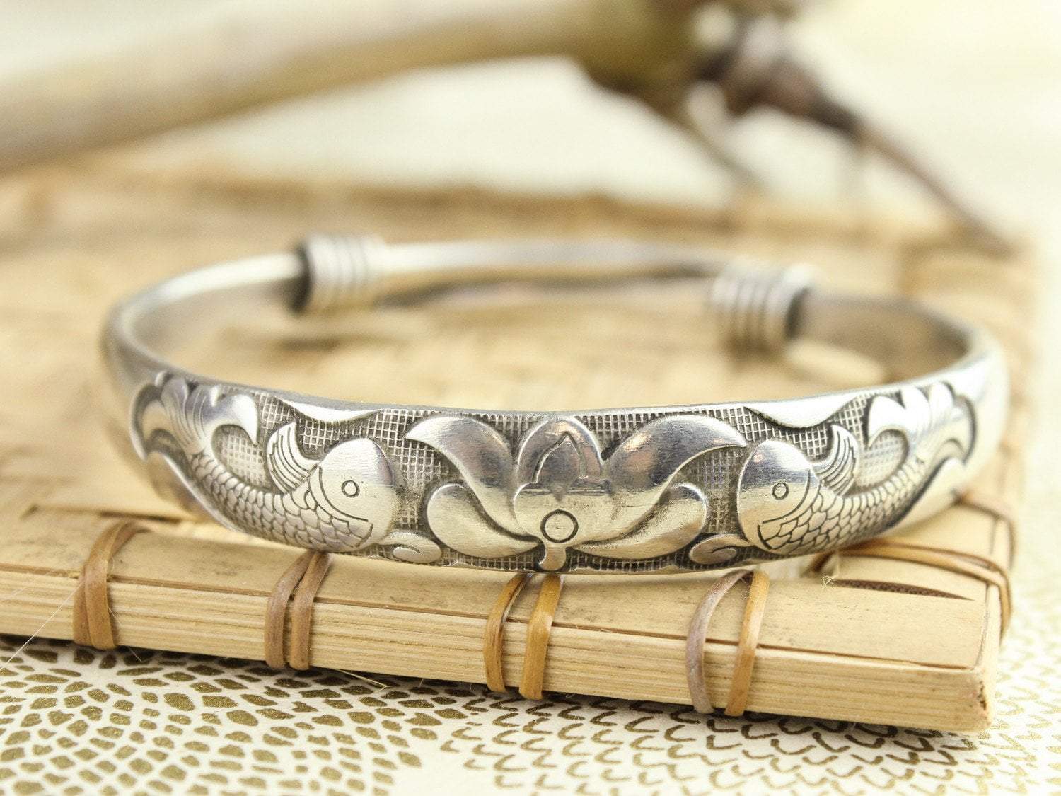 This beautiful bracelet features two familiar 8 Auspicious Symbols. The two golden fish represent fearlessness. Living without danger of drowning in the ocean of sufferings, and migrating from place to place freely and spontaneously, just as fish swim freely without fear through water. The lotus flower, in many cultures, represents purity and peace, blooming through the mud.