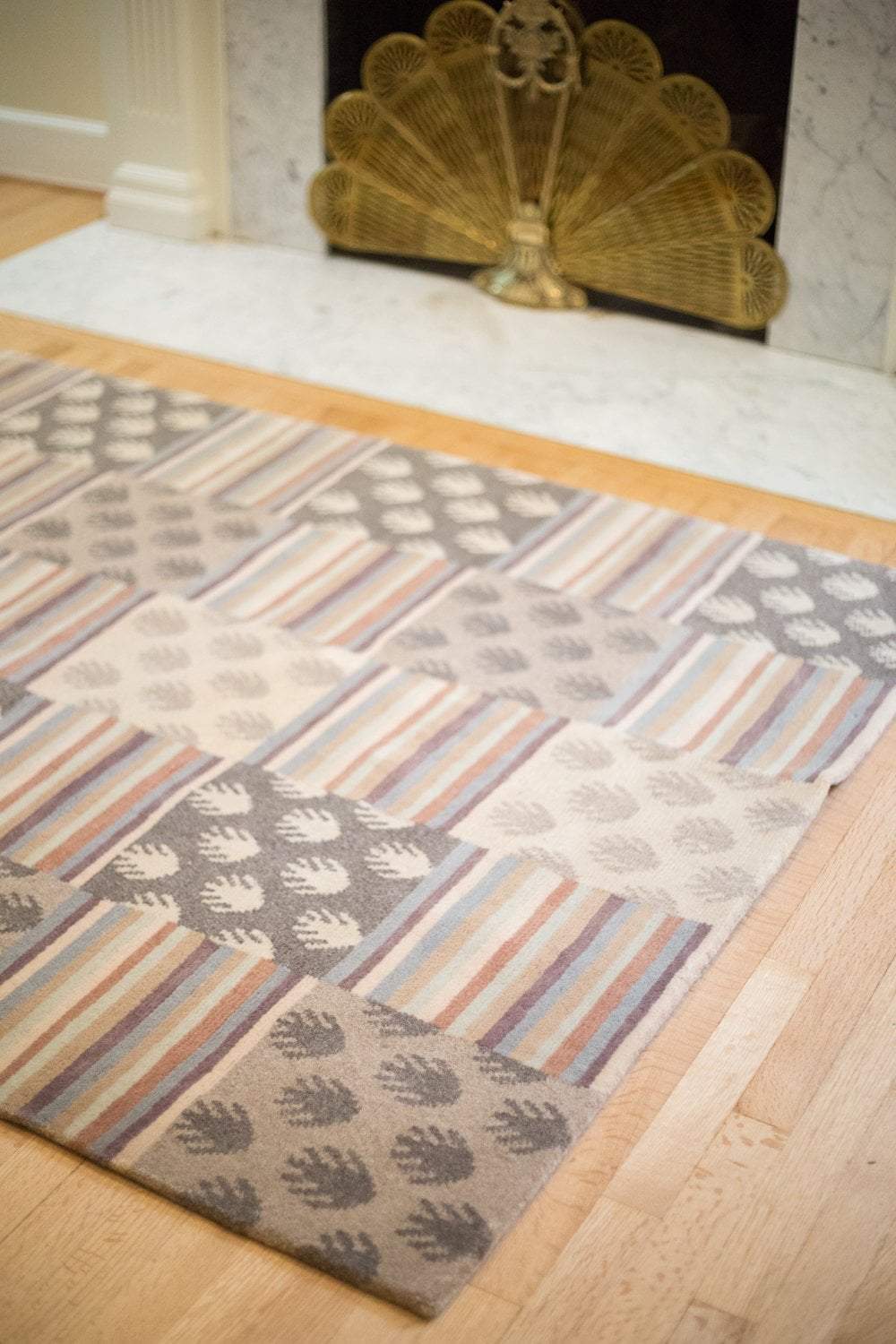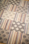This Tibetan wool area rug is truly beautiful.  It is the perfect addition to your home, office, or meditation space, and it will last for generations.  Use a cushion and sit upon it during meditation, or use it as a stylish rug.  It features neutral tones with a striped and Tibetan frog's feet pattern, which is considered to be auspicious.