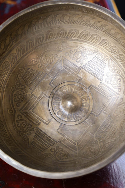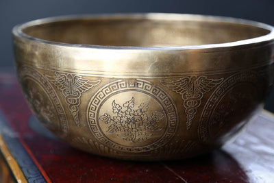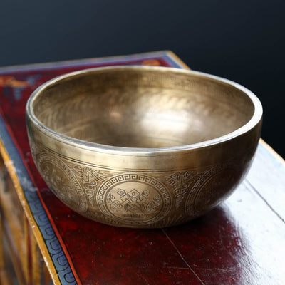 Bowl rings at a F note when struck with a woolen mallet. This note resonates with the Heart Chakra, which is the center of real, unconditional affection, spiritual growth, compassion, devotion and love.