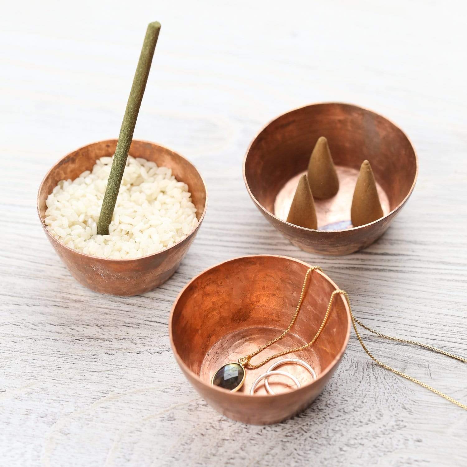 Each vessel is shaped and hammered by hand using traditional metal work techniques. Traditionally, they are used on an altar or shrine as offering bowls and filled with water daily as a way of accumulating virtue and merit.