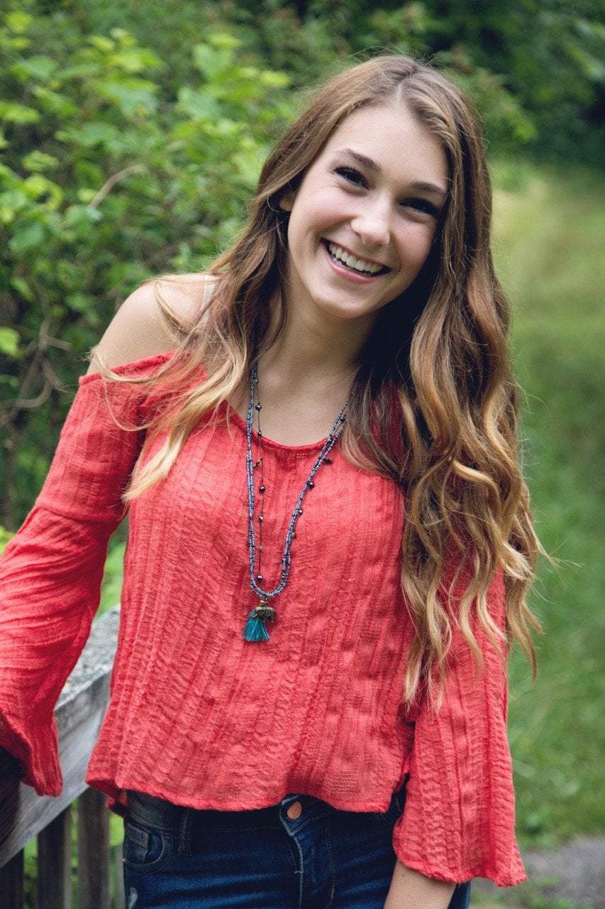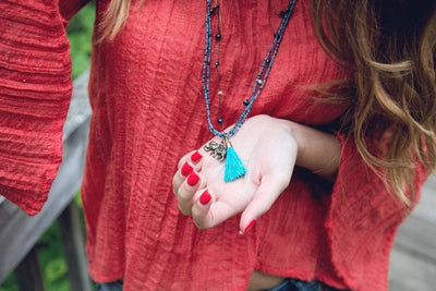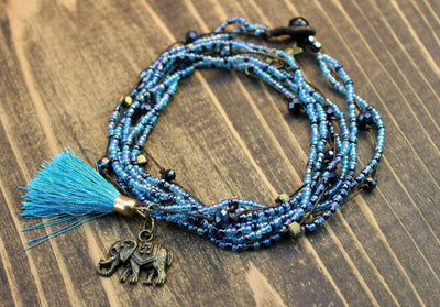 Light blue and dark blue beads combined with brass flower charms and a light blue tassel make up this hand crafted design. Brass elephant charm hangs freely from the bottom. The perfect summer necklace!