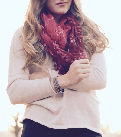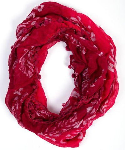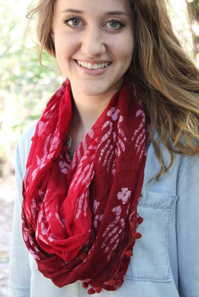 This lightweight cotton, naturally dip-dyed, circular scarf is made using a traditional batik technique and trimmed with soft, tiny poms along the edges for unique look. Beautiful red color.