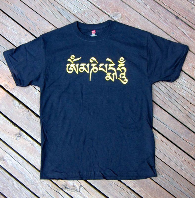 Share a message of Compassion with the rest of the world! This black shirt is printed with the Tibetan mantra, 'Om Mani Padme Hung', in gold lettering. It is 100% cotton and printed in the USA. Allow for small amount of shrinkage. Very popular new design.