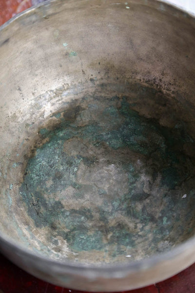 • This is a medium sized, beautifully aged, hand hammered singing bowl with thin walls and plenty of natural patina.  Truly a one-of-a-kind bowl with gorgeous signs of age and wear.